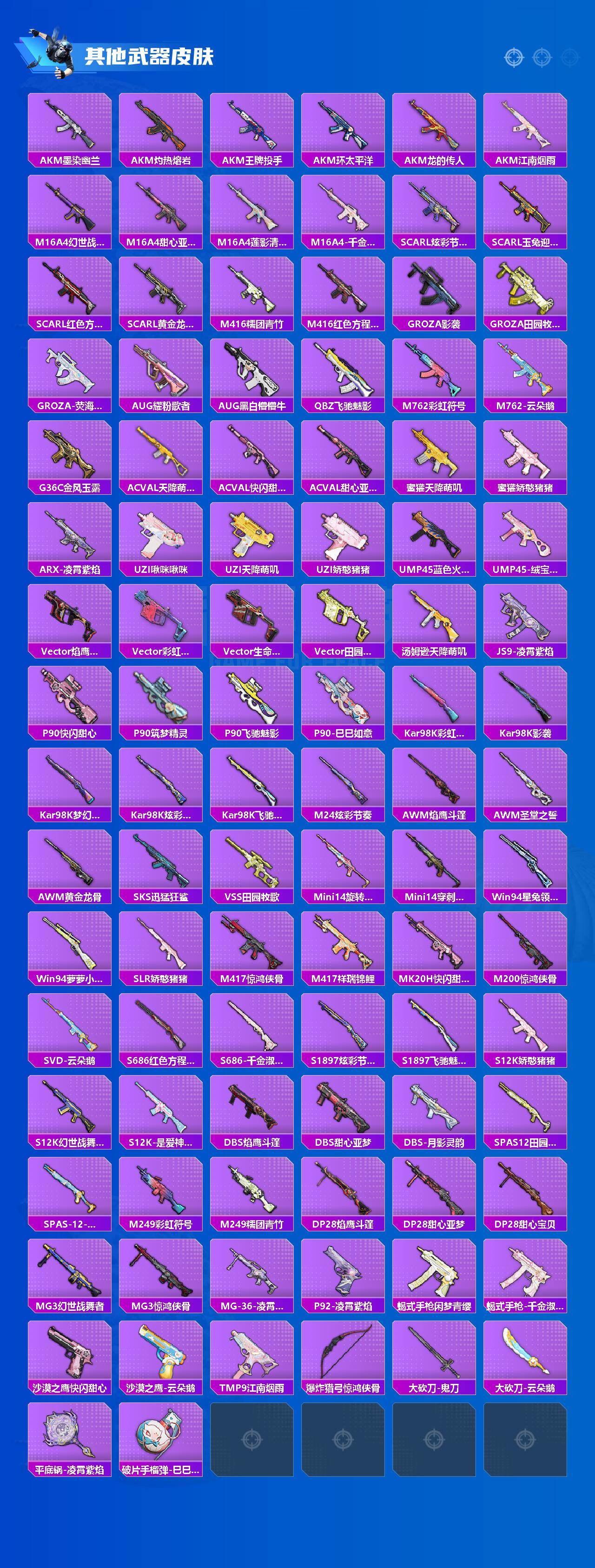 【粉色枪皮】:AKM-星际浪客,SCAR-L-锦绣绵绵,M416-心之恋语,M762-鬼刀,Kar98K-巳巳如意,Mk14-甜梦熊击,SVD-月影灵韵,DP-28-豹影疾电,平底锅-喜羊羊与灰太狼