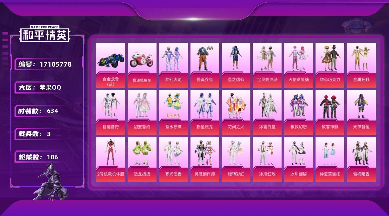 [17105778]【10695668】[10695668]WBDS0029 苹果Q极品身法素材号 怪诞乔克 木乃伊 红螳螂 梦幻火箭 赤蝎幽灵 都市猎人 巧克力三姐妹 花间之火 162套装 186枪皮 26粉装3载具14特效枪 兰博SVJ金色 合金龙骨蓝色 极速兔兔车 奇异狩猎者浪漫天命 宝贝奶油派 天使彩虹糖 甜心巧克力 雪梅暗香 孙悟空 金属狂野 智能音符 放客神游 星之信仰 仲夏莫吉托 天禅智恒 新星烈龙 甜蜜誓约 极致幻想 冰川幽秘 灵感创作师 香水柠檬 冰霜白皇 冰川红玫 旋转彩虹 恐龙拽拽 寒光使者 SCAR-L-纯梦嫁纱 (1级) M416-心之恋语 (1级) Kar98K-伏魔团 (4级) AUG-南国舞曲 (4级) AKM-星际浪客 (1级) M762-激战未来 (5级) SCAR-L-童趣迷兔 (5级) M416-暖熊萌萌 (5级) AKM-梦之光华 (4级) 汤姆逊-冰川粉黛 (5级) M24-翩跹演武 (4级) MG3-炙焰牛王 (4级) 平底锅-林间仙鹿 (3级) GROZA-焦糖拿铁 (4级) 梦幻火箭飞行器 古堡领主飞行器 太空嘟嘟飞行器 星夜魔法师飞行翼 龟仙人 萌神柯基 动感兔斯基 潮萌小黄鸭 呆萌铁蟹 软萌银虎 兔兔白日梦 激萌罗小黑 迅捷狂鲨 浪漫波比 胖达团团 TEC追光队服 TT战队服 神秘黑猫 暗夜契约 暗影哥特 纯白誓言 狂沙舞者 风华少年志 M416-仓鼠灰灰 M24-香水柠檬 梦幻火箭头盔 甜心宝贝头盔 甜蜜誓约头盔 梦幻火箭背包 甜心宝贝背包 萌熊伴侣背包 深海曼妙背包 神秘黑猫背包 古堡领主背包 甜蜜誓约背包