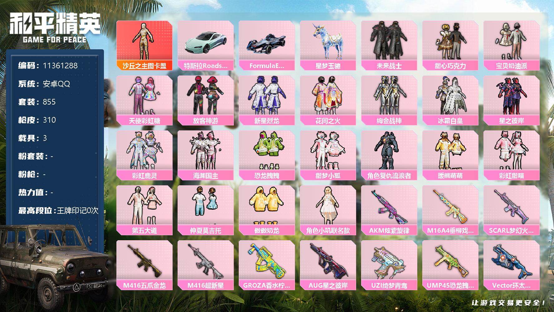 - [12350078]【商品标题】:苹果 手Q-17粉装-5特效枪-3载具-5粉色飞行器-85344热力值-9王牌印记-216套装-261枪皮 【热门品类】:粉装-梦幻火箭,粉装-童趣迷兔,套装-深海小丑鱼,套装-小丑鱼,套装-奇异狩猎者,角色-2B战斗服款,套装-龟仙人,套装-糯粉咩咩,套装-软软马卡龙,小恶魔头饰 【粉色载具】:玛莎拉蒂Ghibli(蓝),宝马X6 M(曼岛绿),辉羽雀灵自行车 【粉色套装】:粉装-木曜青龙,粉装-梦幻火箭,粉装-冰霜白皇,粉装-童趣迷兔,粉装-炙焰红王,粉装-飓风飞鹰,粉装-暗夜玫瑰,粉装-彩虹鹿灵,粉装-山涧鹿灵,粉装-吟月归客,粉装-寒光使者,粉装-萌物绒绒,粉装-炫光之旅,角色-圣堂之誓,角色-幻海仙踪,粉装-星穹咏叹调,粉装-幻彩电音 【粉色枪皮等级】:SCAR-L-青春物语(七级),M416-电玩时刻(五级),Kar98K-巳巳如意(五级),DP-28-圣堂之誓(七级),MG-36-幻彩电音(五级) 【粉色枪皮】:SCAR-L-青春物语,M416-电玩时刻,Kar98K-巳巳如意,DP-28-圣堂之誓,MG-36-幻彩电音 【粉色飞行器】:梦幻火箭飞行器,星夜魔法师飞行翼,闪光银龙飞行器,绝色倾城飞行器,雀灵庇佑飞行器 【粉色降落伞】:甜心宝贝降落伞,至尊龙雀降落伞,春暖花开降落伞,精灵迷巫降落伞,梦幻火箭降落伞,四圣焕新降落伞,童趣迷兔降落伞,林间仙鹿降落伞,蓝莓炮弹降落伞,筑梦精灵降落伞,彩虹甜喵降落伞,未来歌姬降落伞,粉樱探戈降落伞,闲梦青缨降落伞,萌物绒绒降落伞,镜光幻境降落伞,圣堂之誓降落伞,小叽联名款降落伞,蜜语绒猫降落伞,绝色倾城降落伞,拳皇·狂花道降落伞,幻海仙踪降落伞,辉羽雀灵降落伞,幻彩电音降落伞,最终圣卫者降落伞,荧海星豚降落伞 【稀有套装】:套装-龟仙人,套装-巳巳如意,套装-小鸟芋圆,套装-雏菊兔兔,套装-萝兰蝴蝶,角色-风玲,套装-紫幽梦,套装-蓝冰羽,角色-幽澜祭司,角色-鲛海歌灵,套装-霓虹热舞,套装-极速光影,套装-云朵鹅,套装-雪绒豹,角色-时希公主 【稀有枪皮】:AKM-奇异狩猎者,AKM-彩虹符号,AKM-灼热熔岩,AKM-破晓战魂,AKM-缤纷海域,AKM-虎虎生威,AKM-霓虹街区,AKM-龙的传人,AKM-灵猫魔法师,M16A4-天使羽翼,M16A4-幻世战舞者,M16A4-红色方程式,SCA