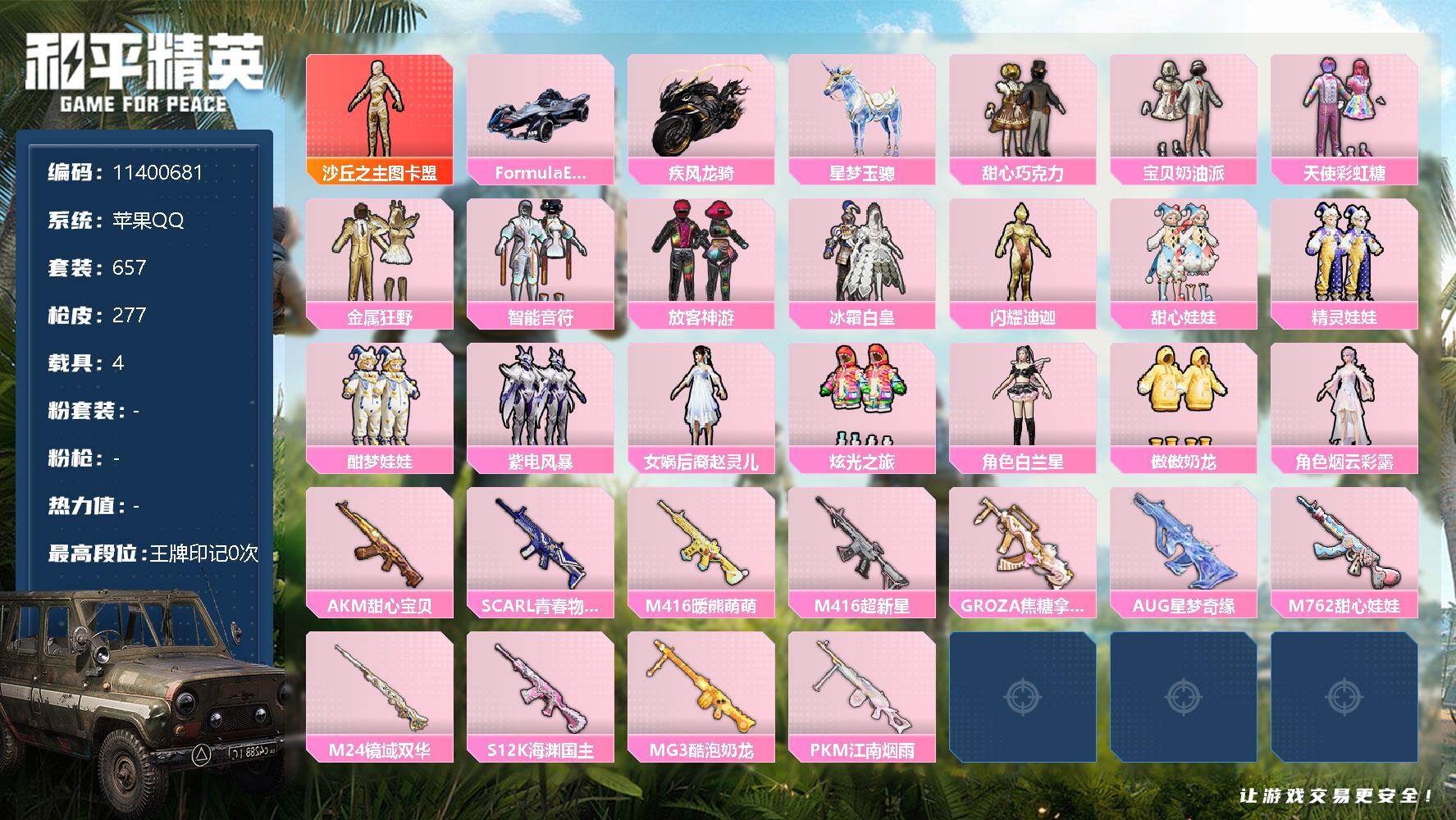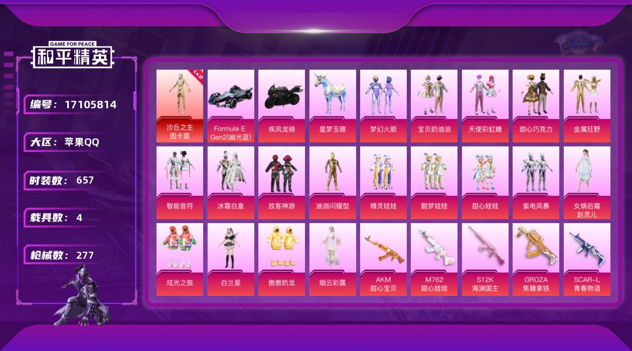 [17105814]【11400681】[11400681]WBDS0064 苹果Q 184套装 277枪皮 1神装20粉装17特效枪5载具 沙丘之主-图卡盟 (2级) M416-超新星 (9级) Formula(幽光蓝) 疾风龙骑 护世瑞兽 星梦玉骢 圣域龙宝僚机 木乃伊 M416-黄金龙骨 AWM-黄金龙骨 M416-星际漫游 都市猎人 派对舞王 派对舞王(金靴子) 梦幻火箭 赵灵儿 白兰星 傲傲奶龙 宝贝奶油派 天使彩虹糖 甜心巧克力 烟云彩露 炫光之旅 金属狂野 智耀战神 酣梦娃娃 精灵娃娃 幻彩电音 智能音符 放客神游 冰霜白皇 闪耀迪迦型 紫电风暴 甜心娃娃 SCAR-L-金蛇镇世 (3级) AKM-甜心宝贝 (6级) AKM-幽焰骑士 (3级) Kar98K-巳巳如意 (5级) MG3-酷泡奶龙 (6级) DP-28-豹影疾电 (5级) AUG-星梦奇缘 (3级) PKM-江南烟雨 (5级) M762-甜心娃娃 (5级) M24-镜域双华 (3级) M416-暖熊萌萌 (1级) S12K-海渊国主 (6级) GROZA-焦糖拿铁 (6级) SCAR-L-青春物语 (5级) 破片手榴弹-瓶中星球 (6级) 破片手榴弹-粉粉猫爪 (7级) 龙翔九天飞行器 深渊漩涡飞行器 天之羽翼飞行器 甜心娃娃飞行器 龟仙人 萌神柯基 2P战斗服款 六号稻草人 红熊茄茄 雪山精英 动感兔斯基 鹰眼刺客 胖达团团 JDE战队服 迪迦奥特曼 赛罗奥特曼 团圆交子 瑞龙福将 粉红小猪 水银刺客 漫步者 英勇保护者 M762-瑞龙福将 甜心宝贝头盔 金羽特工头盔 梦幻火箭背包 甜心宝贝背包 萌熊伴侣背包 金羽特工背包