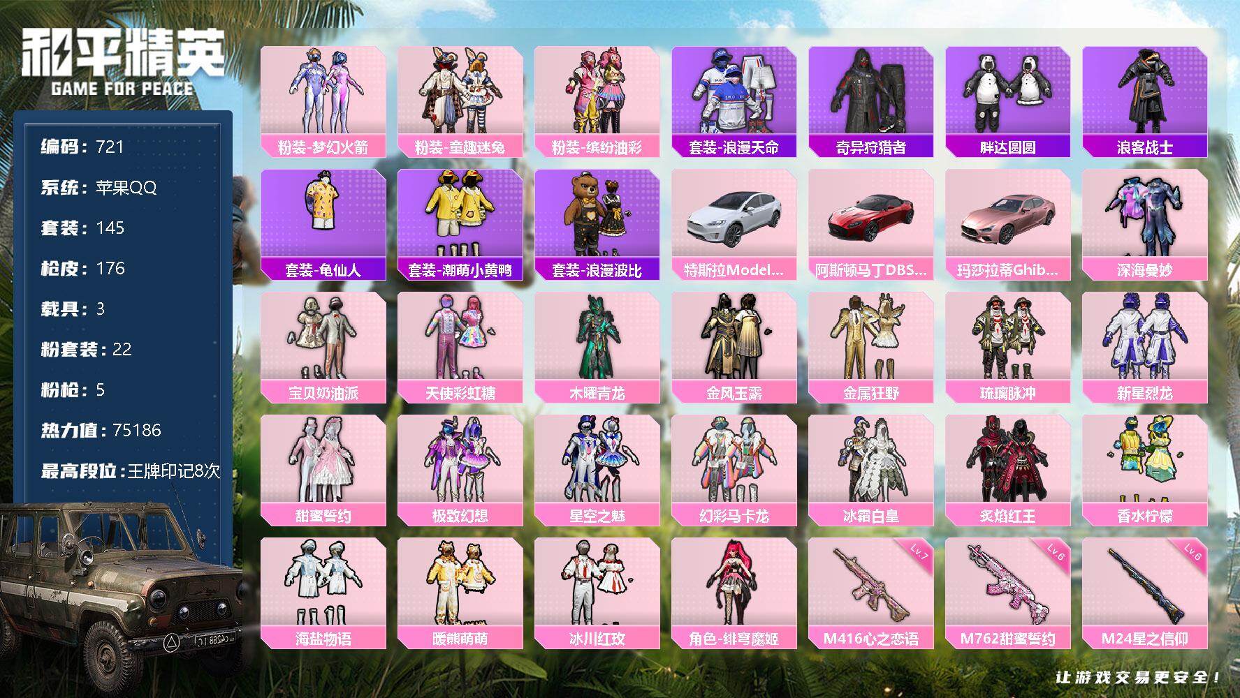 [17105807]【721】苹果 手Q-22粉装-5特效枪-3载具-5粉色飞行器-75186热力值-8王牌印记-145套装-176枪皮 【热门品类】:粉装-梦幻火箭,粉装-童趣迷兔,粉装-缤纷油彩,套装-浪漫天命,套装-奇异狩猎者,套装-胖达圆圆,套装-浪客战士,套装-龟仙人,套装-潮萌小黄鸭,套装-浪漫波比 【粉色载具】:特斯拉Model X(珍珠白),阿斯顿马丁DBS(红),玛莎拉蒂Ghibli(粉) 【粉色套装】:粉装-深海曼妙,粉装-宝贝奶油派,粉装-天使彩虹糖,粉装-木曜青龙,粉装-梦幻火箭,粉装-金风玉露,粉装-金属狂野,粉装-缤纷油彩,粉装-琉璃脉冲,粉装-新星烈龙,粉装-甜蜜誓约,粉装-极致幻想,粉装-星空之魅,粉装-幻彩马卡龙,粉装-冰霜白皇,粉装-童趣迷兔,粉装-炙焰红王,粉装-香水柠檬,粉装-海盐物语,粉装-暖熊萌萌,粉装-冰川红玫,角色-绯穹魔姬 【粉色枪皮等级】:AKM-炫紫旋律(五级),M416-心之恋语(七级),M762-甜蜜誓约(六级),M24-星之信仰(六级),DP-28-豹影疾电(四级) 【粉色枪皮】:AKM-炫紫旋律,M416-心之恋语,M762-甜蜜誓约,M24-星之信仰,DP-28-豹影疾电 【粉色飞行器】:深海曼妙飞行器,精灵迷巫飞行器,梦幻火箭飞行器,神秘黑猫飞行器,心之恋语飞行翼 【粉色降落伞】:深海曼妙降落伞,快乐主宰降落伞,甜心宝贝降落伞,雪国幻梦降落伞,精灵迷巫降落伞,梦幻火箭降落伞,星之信仰降落伞,炫紫旋律降落伞,神秘黑猫降落伞,古堡领主降落伞,甜蜜誓约降落伞,四圣焕新降落伞,心之恋语降落伞,童趣迷兔降落伞,香水柠檬降落伞,冰川粉黛降落伞,第五大道降落伞 【稀有套装】:套装-龟仙人,套装-彩虹兔,套装-云朵鹅,套装-雪绒豹,玩偶服-喜羊羊 【稀有枪皮】:AKM-四圣焕新,AKM-星之信仰,AKM-玉龙,AKM-萌趣颜团子,AKM-虎虎生威,AKM-阿狸红,M16A4-快乐主宰,M16A4-机械英豪,M16A4-生命誓言,M16A4-红色方程式,M16A4-魔法学院,SCAR-L-浪客战士,SCAR-L-炫彩节奏,SCAR-L-甜蜜誓约,SCAR-L-繁花小夜曲,SCAR-L-红色方程式,SCAR-L-冷漠罗丽,M416-夜灯,M416-快乐主宰,M416-潮汐统领,M416-神秘黑猫,M416-红色方程式,M416-绯红前夜,