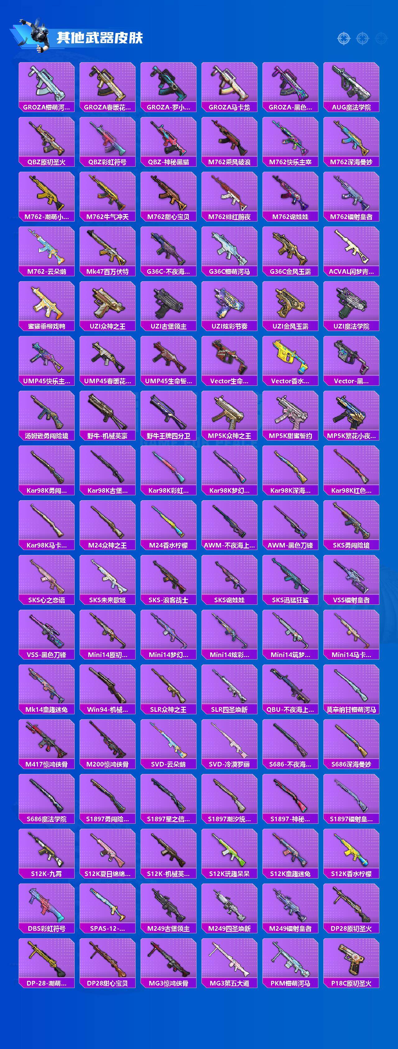 【稀有枪皮】:AKM-四圣焕新,AKM-星之信仰,AKM-玉龙,AKM-萌趣颜团子,AKM-虎虎生威,AKM-阿狸红,M16A4-快乐主宰,M16A4-机械英豪,M16A4-生命誓言,M16A4-红色方程式,M16A4-魔法学院,SCAR-L-浪客战士,SCAR-L-炫彩节奏,SCAR-L-甜蜜誓约,SCAR-L-繁花小夜曲,SCAR-L-红色方程式,SCAR-L-冷漠罗丽,M416-夜灯,M416-快乐主宰,M416-潮汐统领,M416-神秘黑猫,M416-红色方程式,M416-绯红前夜,