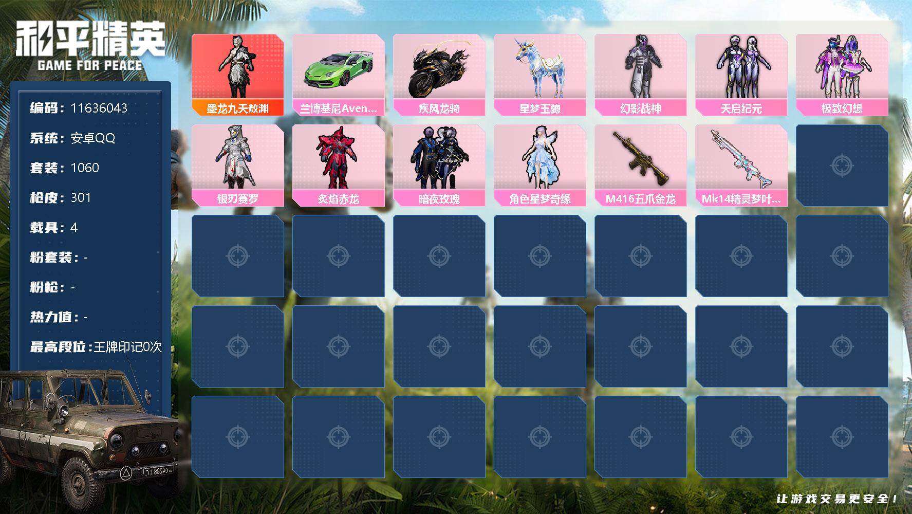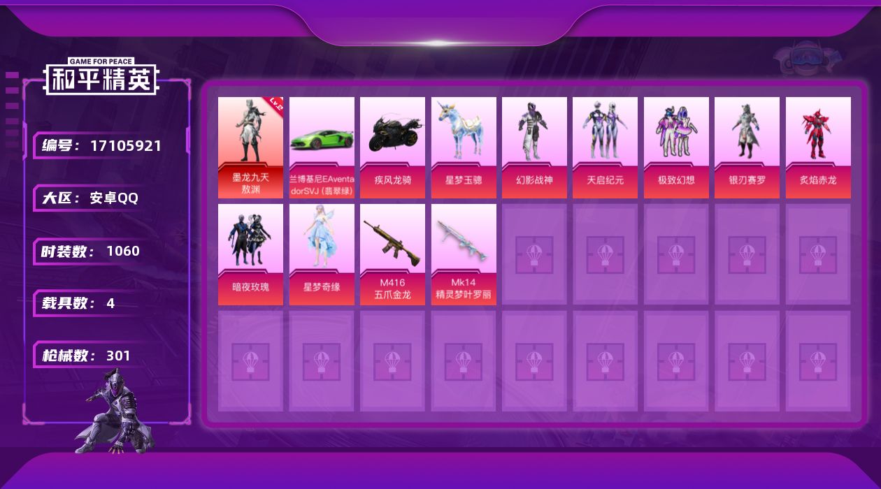 [17105921]【11636043】[11636043]HP0009 安卓Q 266套装 301枪皮 1神装12粉装7特效枪4载具 墨龙九天-敖渊 (2级) M416-五爪金龙 (6级) 玛莎拉蒂粉色 兰博SVJ绿色 疾风龙骑 星梦玉骢 觉醒初号机 美琪 天启纪元 冷漠罗丽 星梦奇缘 创世救赎 幻影战神 星空武士 极致幻想 银刃赛罗 炙焰赤龙 暗夜玫瑰 M416-墨龙九天 (3级) Kar98K-巳巳如意 (1级) DP-28-豹影疾电 (1级) Mk14-精灵梦叶罗丽 (5级) 破片手榴弹-粉粉猫爪 (6级) 烟雾弹-猫咪绅士 (4级) 龙翔九天飞行器 幻海精灵飞行器 鎏金朋克飞行器 星夜魔法师飞行翼 8号机 Mark.06 光子十周年 雪山精英 梦魇先生 万圣娃娃 鹰眼刺客 好奇恐龙 蔷薇魔法师 奇迹天团 大橘为重 浪漫波比 金羽特工 裁决冥王 神秘黑猫 暗影哥特 SS1特训 团圆交子 瑞龙福将 粉红小猪 狂沙舞者 漫步者 海洋之心 破蛋小黄鸡 风华少年志 白月香洋装 新侠客行 软嫩糖心蛋 黑色刀锋 极速红龙 Kar98K-终极赛罗 M762-瑞龙福将 金曜白虎头盔 木曜青龙头盔 百万伏特头盔 精灵迷巫背包 折纸暴龙背包 幻影战神背包 金风玉露背包 萌熊伴侣背包 神秘黑猫背包 古堡领主背包