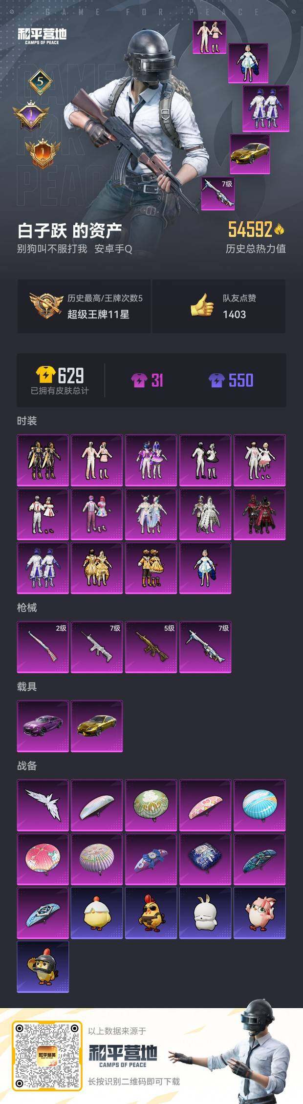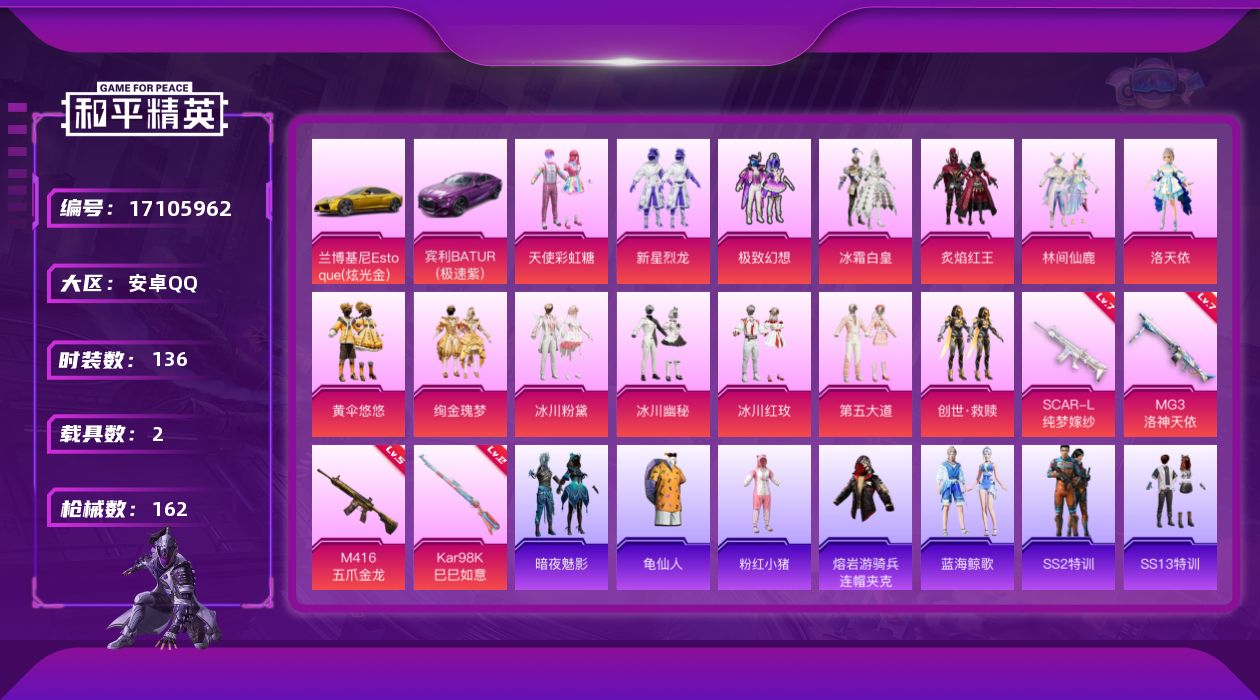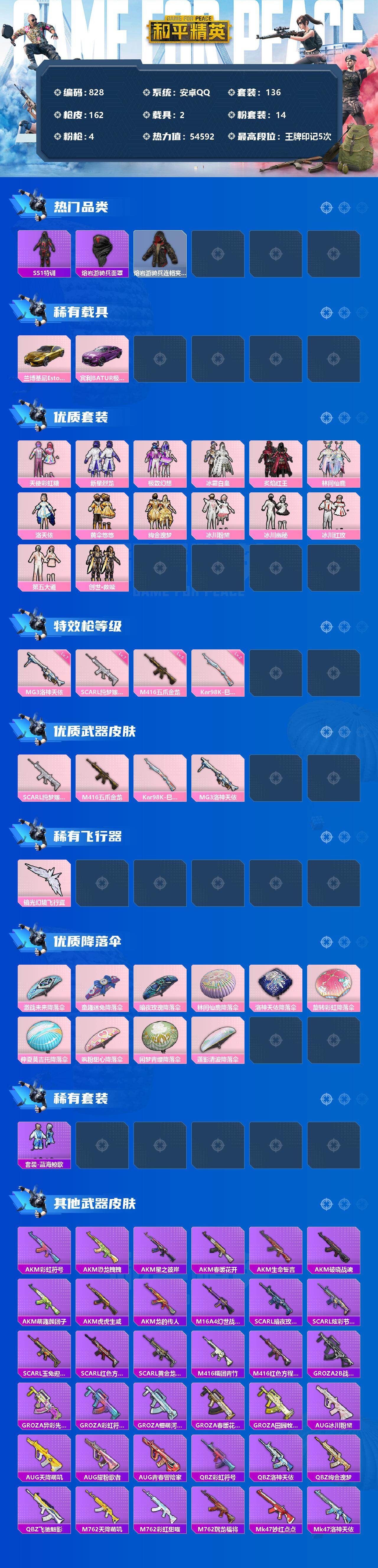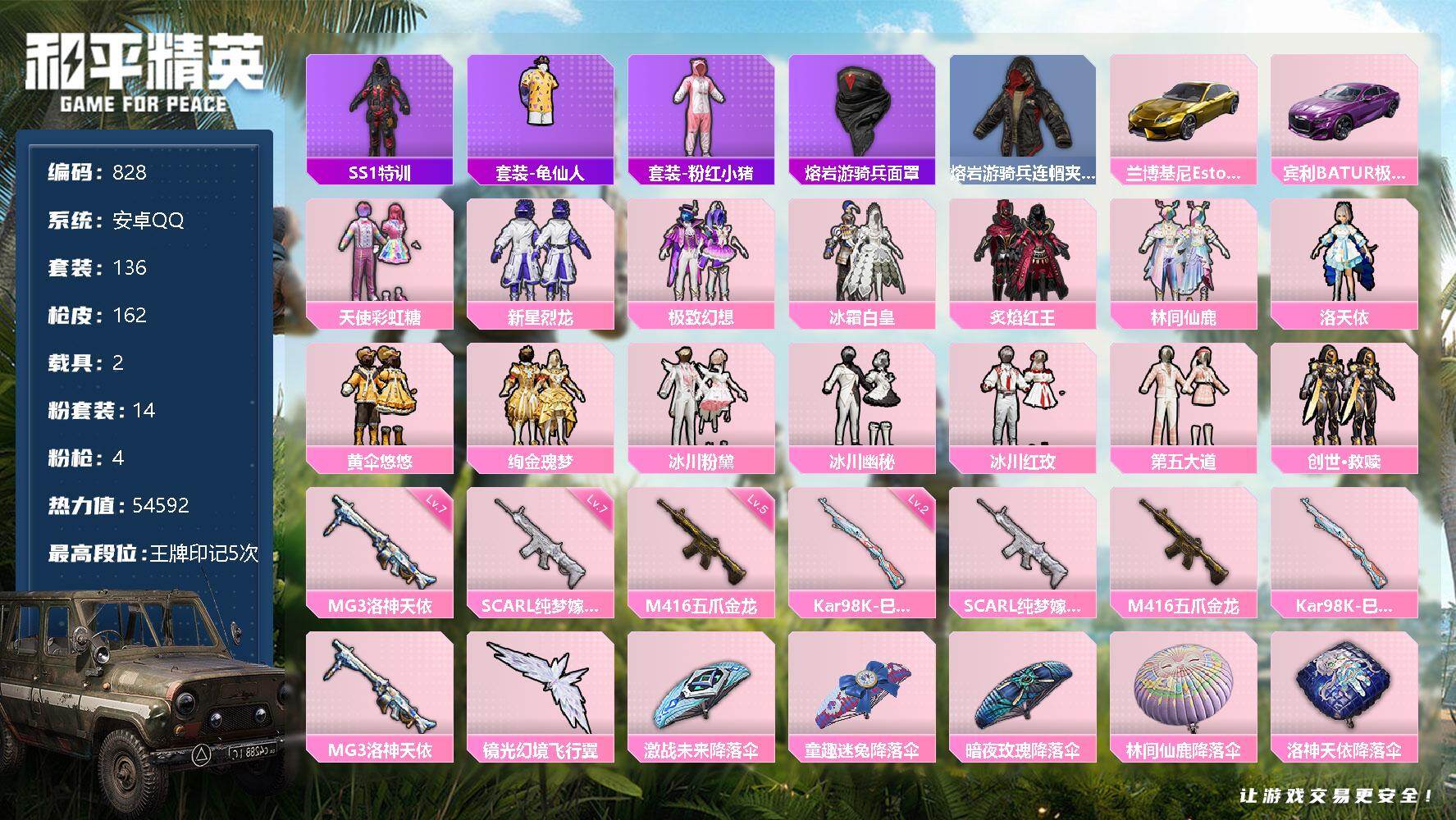 [17105962]【828】安卓 手Q-14粉装-4特效枪-2载具-1粉色飞行器-54592热力值-5王牌印记-136套装-162枪皮 【热门品类】:套装-SS1特训,套装-龟仙人,套装-粉红小猪,熔岩游骑兵面罩,熔岩游骑兵连帽夹克 【粉色载具】:兰博基尼Estoque(炫光金),宾利BATUR(极速紫) 【粉色套装】:粉装-天使彩虹糖,粉装-新星烈龙,粉装-极致幻想,粉装-冰霜白皇,粉装-炙焰红王,粉装-林间仙鹿,角色-洛天依,粉装-黄伞悠悠,粉装-绚金瑰梦,粉装-冰川粉黛,粉装-冰川幽秘,粉装-冰川红玫,粉装-第五大道,套装-创世·救赎 【粉色枪皮等级】:SCAR-L-纯梦嫁纱(七级),M416-五爪金龙(五级),Kar98K-巳巳如意(二级),MG3-洛神天依(七级) 【粉色枪皮】:SCAR-L-纯梦嫁纱,M416-五爪金龙,Kar98K-巳巳如意,MG3-洛神天依 【粉色飞行器】:镜光幻境飞行翼 【粉色降落伞】:激战未来降落伞,童趣迷兔降落伞,暗夜玫瑰降落伞,林间仙鹿降落伞,洛神天依降落伞,旋转彩虹降落伞,仲夏莫吉托降落伞,飒粉甜心降落伞,闲梦青缨降落伞,莲影清波降落伞 【稀有套装】:套装-龟仙人,套装-蓝海鲸歌 【稀有枪皮】:AKM-彩虹符号,AKM-恐龙拽拽,AKM-星之彼岸,AKM-春暖花开,AKM-生命誓言,AKM-破晓战魂,AKM-萌趣颜团子,AKM-虎虎生威,AKM-龙的传人,M16A4-幻世战舞者,SCAR-L-暗夜玫瑰,SCAR-L-炫彩节奏,SCAR-L-玉兔迎春,SCAR-L-红色方程式,SCAR-L-黄金龙骨,M416-糯团青竹,M416-红色方程式,GROZA-2B战斗服款,GROZA-异彩先驱,GROZA-彩虹符号,GROZA-懵萌河马,GROZA-春暖花开,GROZA-田园牧歌,AUG-冰川粉黛,AUG-天降萌叽,AUG-耀粉歌者,AUG-青春冒险家,QBZ-彩虹符号,QBZ-洛神天依,QBZ-绚金瑰梦,QBZ-飞驰魅影,M762-天降萌叽,M762-彩虹甜喵,M762-瑞龙福将,Mk47-妙红点点,Mk47-洛神天依,Mk47-青春冒险家,G36C-懵萌河马,AC-VAL-天降萌叽,AC-VAL-快闪甜心,蜜獾-娇憨猪猪,UZI-天降萌叽,UZI-娇憨猪猪,UZI-影袭,UZI-炫彩节奏,UZI-生命誓言,UMP45-春暖花开,UMP45-灵符