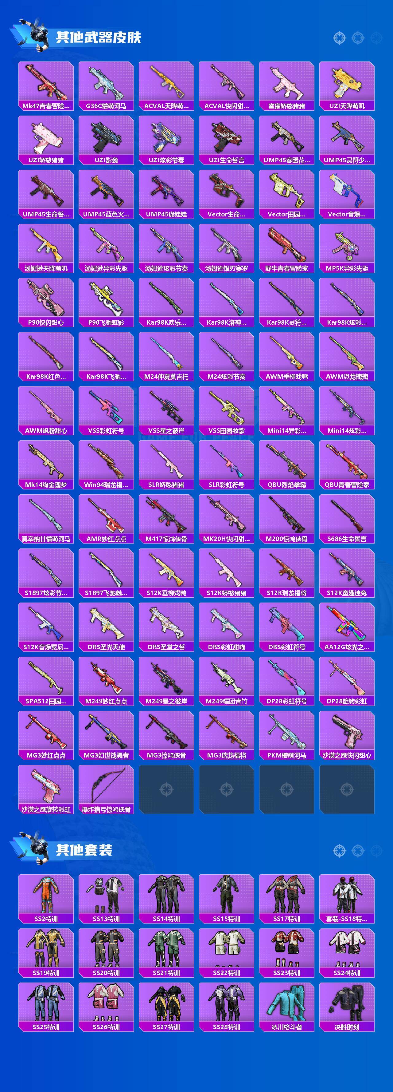 【稀有枪皮】:AKM-彩虹符号,AKM-恐龙拽拽,AKM-星之彼岸,AKM-春暖花开,AKM-生命誓言,AKM-破晓战魂,AKM-萌趣颜团子,AKM-虎虎生威,AKM-龙的传人,M16A4-幻世战舞者,SCAR-L-暗夜玫瑰,SCAR-L-炫彩节奏,SCAR-L-玉兔迎春,SCAR-L-红色方程式,SCAR-L-黄金龙骨,M416-糯团青竹,M416-红色方程式,GROZA-2B战斗服款,GROZA-异彩先驱,GROZA-彩虹符号,GROZA-懵萌河马,GROZA-春暖花开,GROZA-田园牧歌,AUG-冰川粉黛,AUG-天降萌叽,AUG-耀粉歌者,AUG-青春冒险家,QBZ-彩虹符号,QBZ-洛神天依,QBZ-绚金瑰梦,QBZ-飞驰魅影,M762-天降萌叽,M762-彩虹甜喵,M762-瑞龙福将,Mk47-妙红点点,Mk47-洛神天依,Mk47-青春冒险家,G36C-懵萌河马,AC-VAL-天降萌叽,AC-VAL-快闪甜心,蜜獾-娇憨猪猪,UZI-天降萌叽,UZI-娇憨猪猪,UZI-影袭,UZI-炫彩节奏,UZI-生命誓言,UMP45-春暖花开,UMP45-灵符