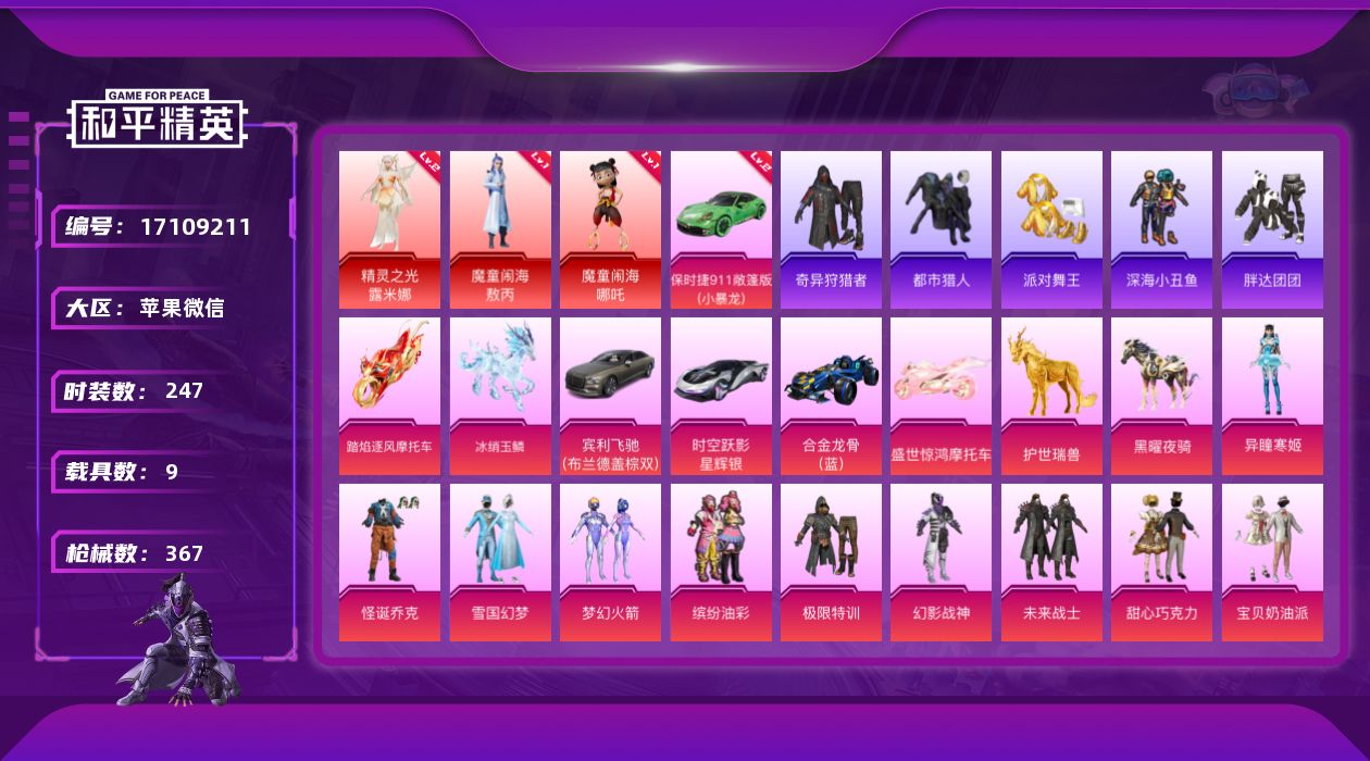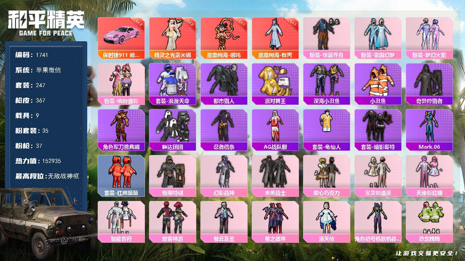 [17109211]【1741】苹果 微信-无敌战神框-3神装-35粉装-37特效枪-9载具-19粉色飞行器-152935热力值-12王牌印记-247套装-367枪皮