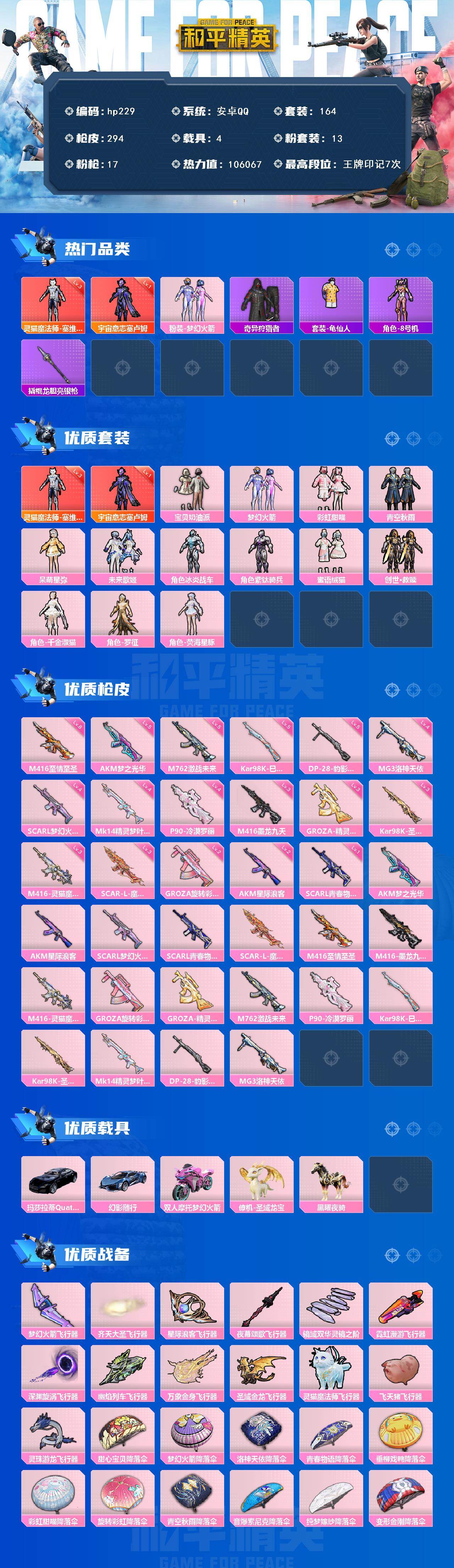 [17018551]安卓 手Q-2神装-13粉装-17特效枪-4载具-13粉色飞行器-106067热力值-7王牌印记-164套装-294枪皮 【红色神装等级】:灵猫魔法师-塞维尔(三级),宇宙意志-塞卢姆(一级) 【红色角色神装】:灵猫魔法师-塞维尔,宇宙意志-塞卢姆 【热门品类】:粉装-梦幻火箭,套装-奇异狩猎者,套装-龟仙人,角色-8号机,撬棍-龙胆亮银枪 【粉色套装】:粉装-宝贝奶油派,粉装-梦幻火箭,粉装-彩虹甜喵,粉装-青空秋雨,角色-呆萌星弥,粉装-未来歌姬,角色-冰炎战车,角色-紫钛骑兵,粉装-蜜语绒猫,套装-创世·救赎,角色-千金淑猫,角色-罗征,角色-荧海星豚 【粉色枪皮等级】:AKM-梦之光华(五级),AKM-星际浪客(二级),SCAR-L-梦幻火箭(四级),SCAR-L-青春物语(一级),SCAR-L-魔童闹海 哪吒(三级),M416-至情至圣(八级),M416-墨龙九天(三级),M416-灵猫魔法师(三级),GROZA-旋转彩虹(二级),GROZA-精灵之光(三级),M762-激战未来(五级),P90-冷漠罗丽(四级),Kar98K-巳巳如意(五级),Kar98K-圣域龙灵(三级),Mk14-精灵梦叶罗丽(四级),DP-28-豹影疾电(五级),MG3-洛神天依(四级) 【粉色载具】:玛莎拉蒂Quattroporte(夜幕蓝),幻影随行,双人摩托-梦幻火箭,僚机-圣域龙宝,黑曜夜骑 【粉色枪皮】:AKM-梦之光华,AKM-星际浪客,SCAR-L-梦幻火箭,SCAR-L-青春物语,SCAR-L-魔童闹海 哪吒,M416-至情至圣,M416-墨龙九天,M416-灵猫魔法师,GROZA-旋转彩虹,GROZA-精灵之光,M762-激战未来,P90-冷漠罗丽,Kar98K-巳巳如意,Kar98K-圣域龙灵,Mk14-精灵梦叶罗丽,DP-28-豹影疾电,MG3-洛神天依 【粉色飞行器】:梦幻火箭飞行器,齐天大圣飞行器,星际浪客飞行器,夜幕颂歌飞行器,镜域双华-灵镜之阶,霓虹漫游飞行器,深渊漩涡飞行器,幽焰列车飞行器,万象金身飞行器,圣域金龙飞行器,灵猫魔法师飞行器,飞天猪飞行器,灵珠游龙飞行器 【粉色降落伞】:甜心宝贝降落伞,梦幻火箭降落伞,洛神天依降落伞,青春物语降落伞,垂柳戏鸭降落伞,彩虹甜喵降落伞,旋转彩虹降落伞,青空秋雨降落伞,音爆索尼克降落伞,纯梦嫁纱降落伞,变形