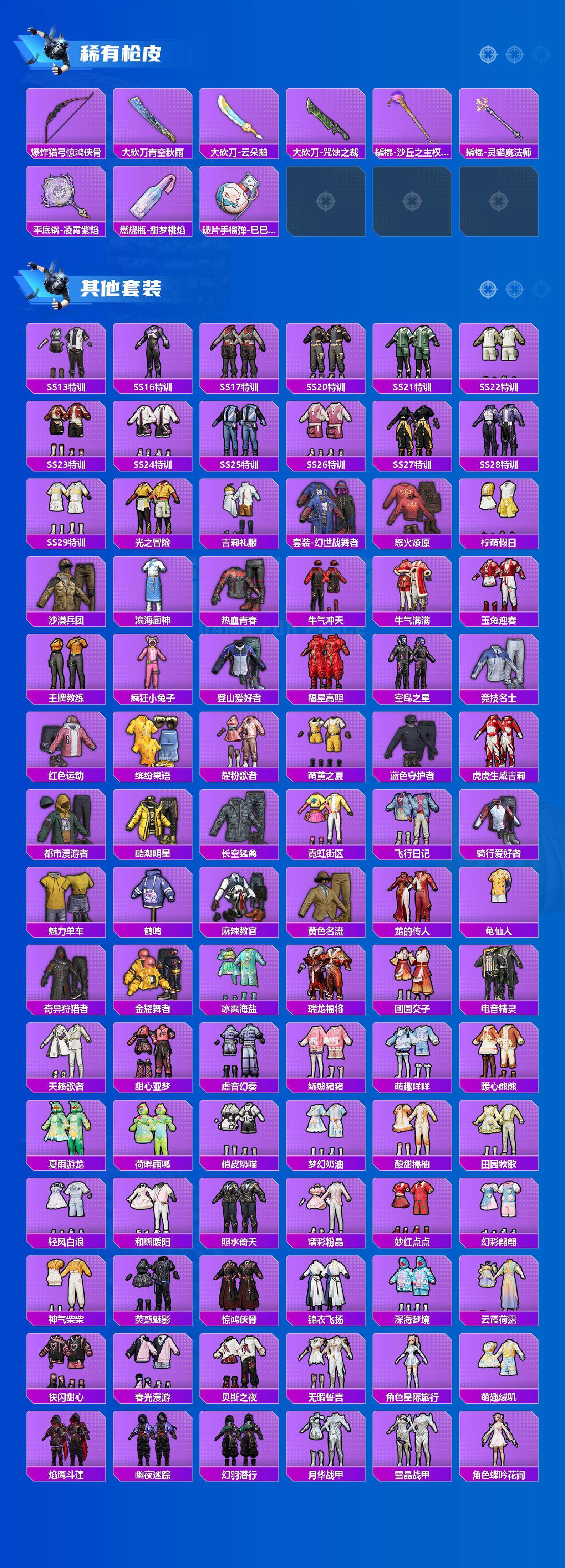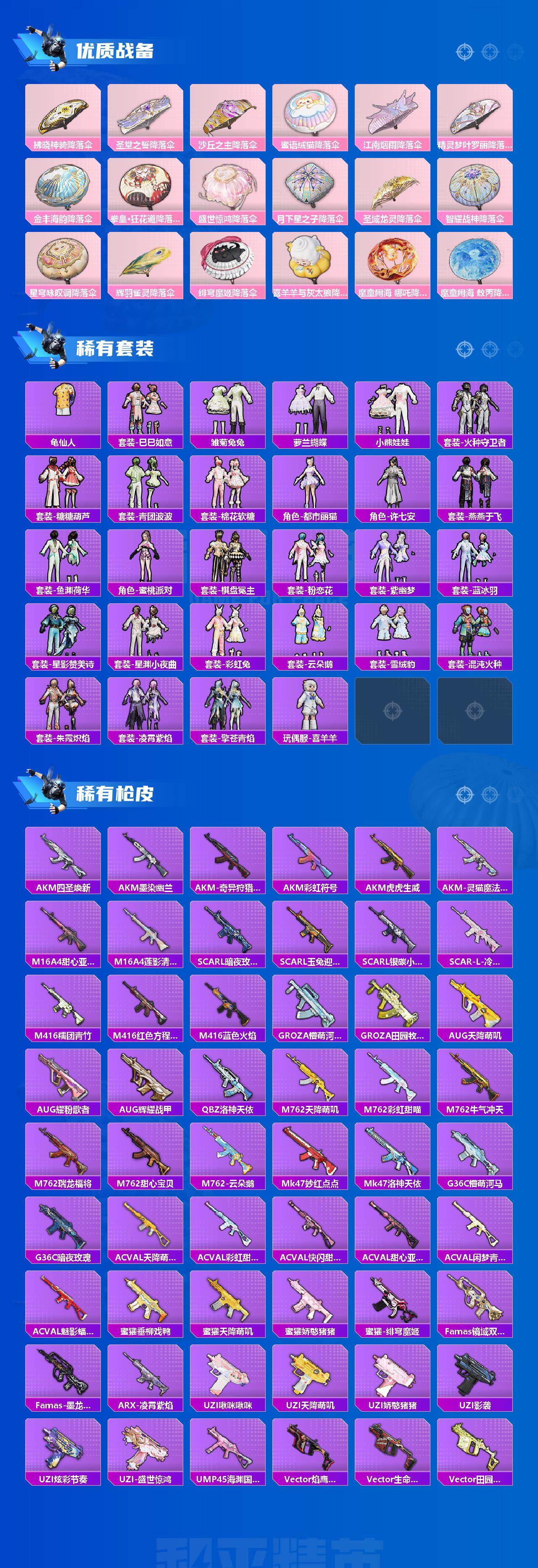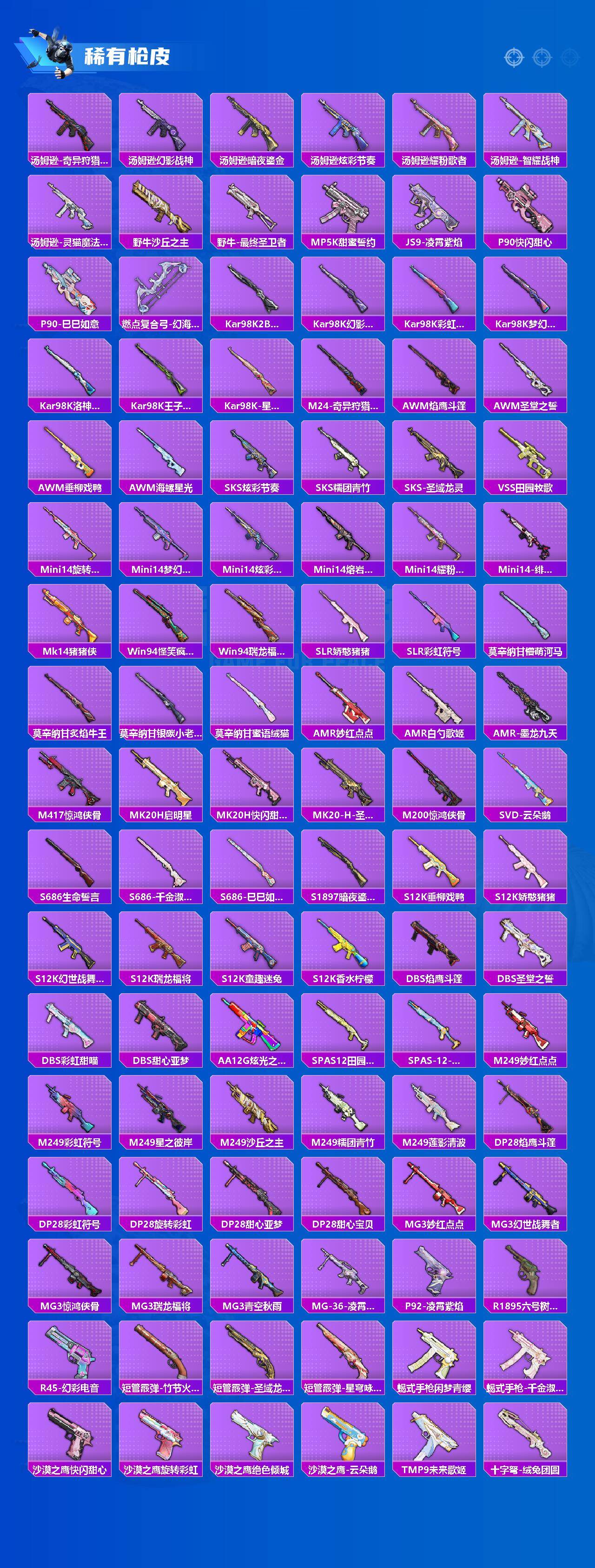AKM-梦之光华,AKM-星际浪客,SCAR-L-梦幻火箭,SCAR-L-青春物语,M416-至情至圣,M416-墨龙九天,GROZA-旋转彩虹,GROZA-精灵之光,M762-激战未来,Kar98K-巳巳如意,Kar98K-圣域龙灵,Mk14-精灵梦叶罗丽,MG3-洛神天依
