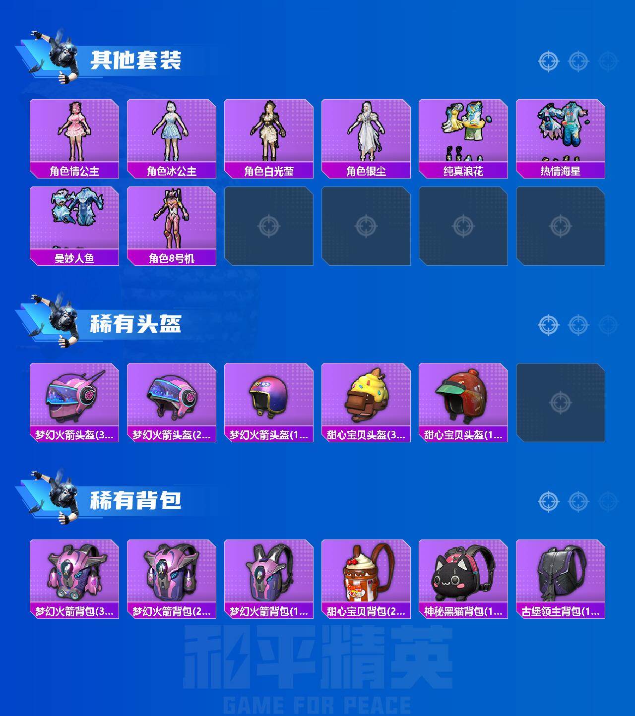 【粉色套装】:粉装-宝贝奶油派,粉装-梦幻火箭,粉装-彩虹甜喵,粉装-青空秋雨,角色-呆萌星弥,粉装-未来歌姬,角色-冰炎战车,角色-紫钛骑兵,粉装-蜜语绒猫,套装-创世·救赎,角色-千金淑猫,角色-罗征,角色-荧海星豚