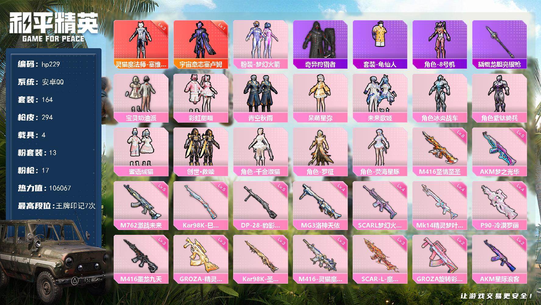 [17018551]安卓 手Q-2神装-13粉装-17特效枪-4载具-13粉色飞行器-106067热力值-7王牌印记-164套装-294枪皮