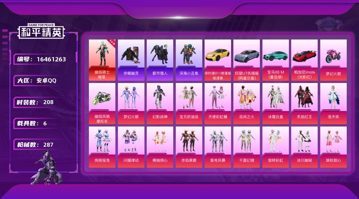 [16461263]安卓 手Q-1神装-21粉装-11特效枪-6载具-11粉色飞行器-118881热力值-13王牌印记-208套装-287枪皮 【红色神装等级】:幽焰骑士-维塔(三级) 【红色角色神装】:幽焰骑士-维塔 【热门品类】:粉装-梦幻火箭,套装-浪漫天命,套装-赤蝎幽灵,套装-都市猎人,套装-深海小丑鱼,角色-军刀雅典娜,套装-星河浪客,套装-暗夜行者,套装-龟仙人,套装-暗影哥特,角色-8号机,角色-Mark.06,熔岩游骑兵连帽夹克 【粉色套装】:粉装-幻影战神,粉装-宝贝奶油派,粉装-天使彩虹糖,粉装-梦幻火箭,粉装-花间之火,粉装-冰霜白皇,粉装-炙焰红王,角色-洛天依,粉装-绚丽摇曳,粉装-闪耀律动,粉装-橘柚倾心,粉装-赤焰黑爵,粉装-紫电风暴,粉装-千面幻镜,粉装-旋转彩虹,粉装-冰川幽秘,粉装-飒粉甜心,粉装-闲梦青缨,粉装-蜜语绒猫,角色-光极星,角色-初号机 觉醒Ver. 【粉色枪皮等级】:AKM-星际浪客(六级),AKM-幽焰骑士(三级),SCAR-L-青春物语(六级),SCAR-L-锦绣绵绵(五级),M416-五爪金龙(六级),M416-超新星(六级),GROZA-旋转彩虹(五级),UMP45-启明星(七级),Kar98K-巳巳如意(五级),DP-28-豹影疾电(五级),MG3-洛神天依(六级) 【粉色载具】:仰望U7(阿盖尔紫),宝马X6 M(曼岛绿),帕加尼imola(光影红),保时捷911 敞篷版(极速黄),双人摩托-梦幻火箭,幽焰风驰摩托车 【粉色枪皮】:AKM-星际浪客,AKM-幽焰骑士,SCAR-L-青春物语,SCAR-L-锦绣绵绵,M416-五爪金龙,M416-超新星,GROZA-旋转彩虹,UMP45-启明星,Kar98K-巳巳如意,DP-28-豹影疾电,MG3-洛神天依 【粉色飞行器】:梦幻火箭飞行器,齐天大圣飞行器,天之羽翼飞行器,星夜魔法师飞行翼,千面幻镜飞行器,歌者泠鸢飞行器,黄族统领飞行器,沙丘之主天马,繁龙极客飞行器,幽焰列车飞行器 【粉色降落伞】:幻影战神降落伞,百万伏特降落伞,甜心宝贝降落伞,梦幻火箭降落伞,四圣焕新降落伞,童趣迷兔降落伞,星之彼岸降落伞,怪笑疯兔降落伞,烈焰拳霸降落伞,齐天大圣降落伞,洛神天依降落伞,海渊国主降落伞,流星咚咚降落伞,天之羽翼降落伞,碧影闪光降落伞,幻梦音符降落伞,星夜魔法师降落伞,环太平