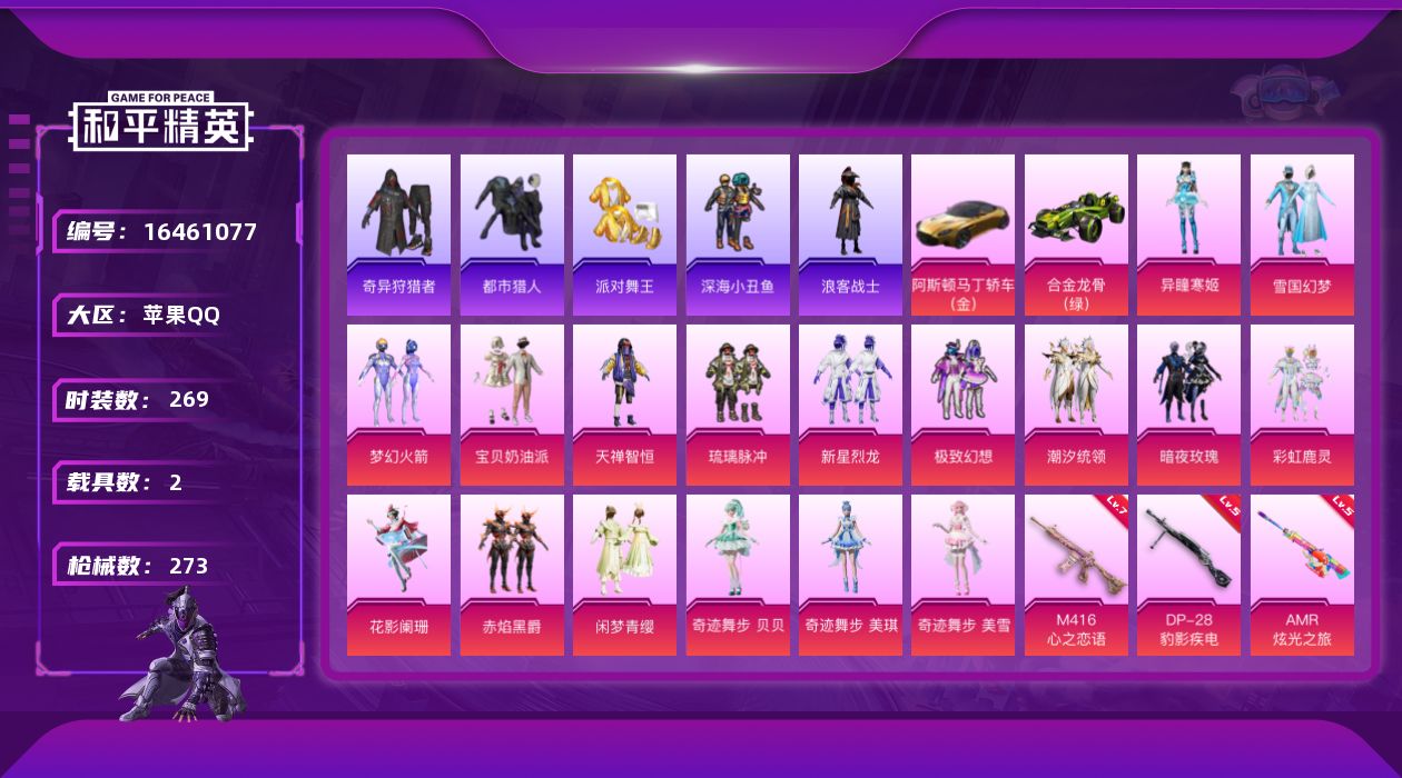 [16461077]苹果 手Q-17粉装-7特效枪-2载具-6粉色飞行器-99672热力值-14王牌印记-269套装-273枪皮