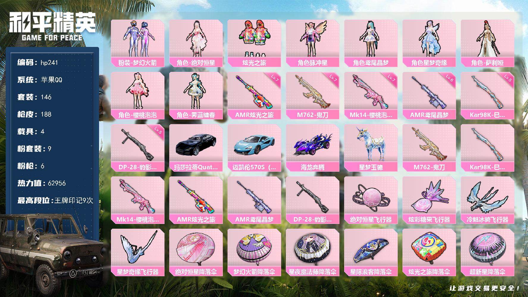 [16860323]苹果 手Q-9粉装-6特效枪-4载具-4粉色飞行器-62956热力值-9王牌印记-146套装-188枪皮