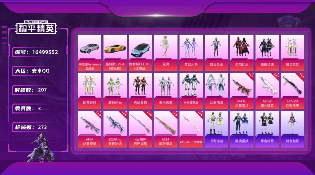 [16499552]安卓 手Q-13粉装-10特效枪-3载具-8粉色飞行器-99801热力值-17王牌印记-207套装-273枪皮 【热门品类】:粉装-梦幻火箭,套装-浪漫天命,套装-龟仙人,套装-粉红小猪 【粉色套装】:粉装-梦幻火箭,粉装-彗云及圣,粉装-炙焰红王,粉装-暗夜玫瑰,粉装-精灵娃娃,粉装-酣梦娃娃,粉装-碧影闪光,粉装-赤焰黑爵,粉装-紫电风暴,粉装-未来领航者,粉装-幻彩电音,角色-花灵,角色-罪夜之冕 【粉色枪皮等级】:AKM-炫紫旋律(五级),SCAR-L-青春物语(五级),M416-风花雪月(七级),M762-甜心娃娃(七级),AKS-74U-森灵之息(四级),Kar98K-巳巳如意(五级),M24-翩跹演武(五级),DP-28-千金淑猫(四级),DP-28-豹影疾电(五级) 【粉色载具】:路特斯EVIJA(星际黄),路特斯ELETRE(冰川蓝),保时捷Panamera(星辰紫) 【粉色枪皮】:AKM-炫紫旋律,SCAR-L-青春物语,M416-风花雪月,AUG-罪夜之冕,M762-甜心娃娃,AKS-74U-森灵之息,Kar98K-巳巳如意,M24-翩跹演武,DP-28-千金淑猫,DP-28-豹影疾电 【粉色飞行器】:梦幻火箭飞行器,阿狸红飞行器,沙丘之主天马,镜域双华-灵镜之阶,幽焰列车飞行器,灵珠游龙飞行器,极意拳锋飞行器 【粉色降落伞】:梦幻火箭降落伞,炫紫旋律降落伞,香水柠檬降落伞,暗夜玫瑰降落伞,甜心娃娃降落伞,青春物语降落伞,庄周梦蝶降落伞,橘柚倾心降落伞,冷魅冰骑降落伞,炙焰牛王降落伞,翩跹演武降落伞,彩虹甜喵降落伞,青空秋雨降落伞,音爆索尼克降落伞,沙丘之主降落伞,精灵梦叶罗丽降落伞,墨龙九天降落伞,时空协奏降落伞,英伦信使降落伞,幽焰骑士降落伞,千金淑猫降落伞,幻彩电音降落伞,无垠阁降落伞,异瞳寒姬降落伞,炫彩糖果降落伞,罪夜之冕降落伞 【稀有套装】:套装-龟仙人,套装-航行童话,套装-巳巳如意,套装-小鸟芋圆,套装-炫彩糖果,套装-糖糖葫芦,套装-青团波波,套装-棉花软糖,角色-都市丽猫,角色-摩登魅猫,套装-燕燕于飞,套装-鱼渊荷华,套装-粉恋花,套装-紫幽梦,套装-蓝冰羽,套装-极速光影,角色-绯色魅影,角色-紫俏灵猫,套装-书海巡游,套装-画境星梦,套装-琴音绮想,角色-霜刃之御,角色-月烬之祷 【稀有枪皮】:AKM-夜灯,AKM-