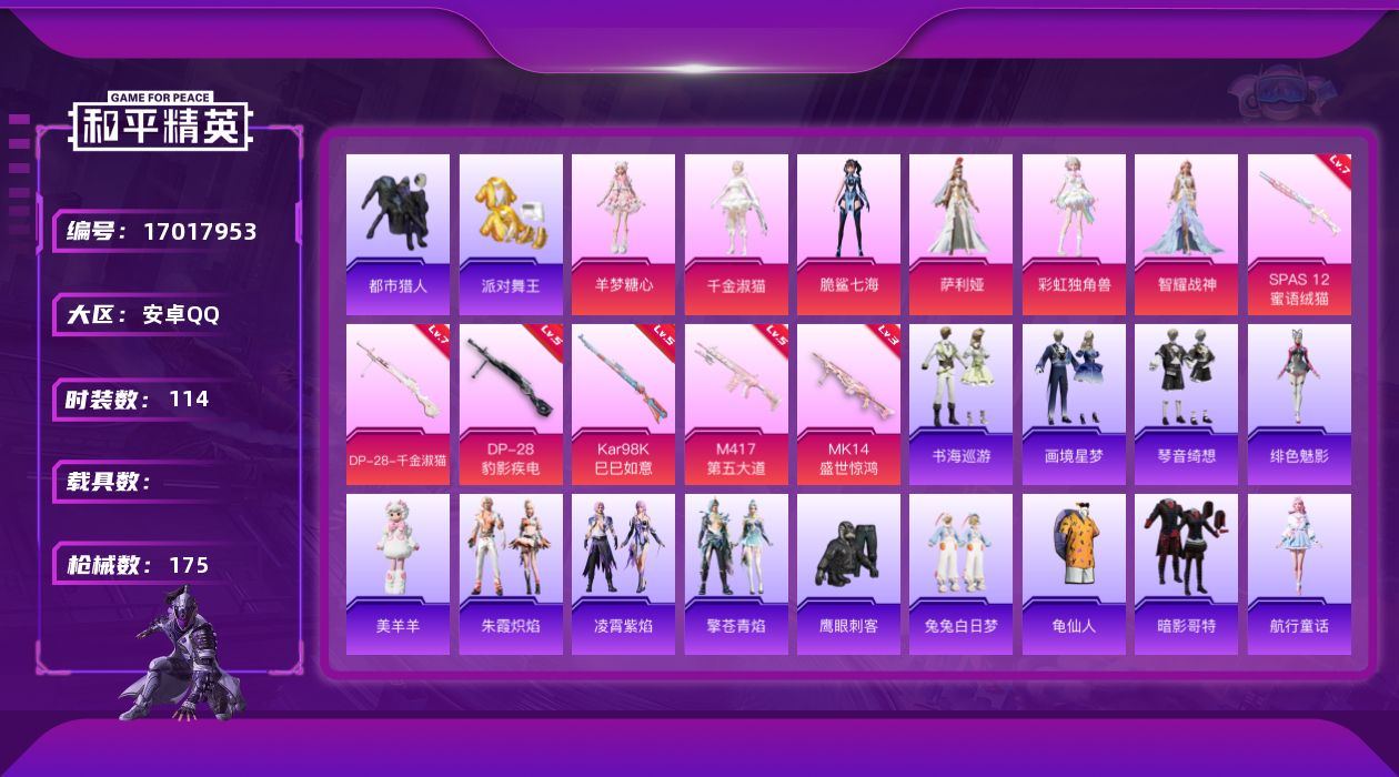 [17017953]安卓 手Q-6粉装-6特效枪-0载具-7粉色飞行器-55578热力值-9王牌印记-114套装-175枪皮