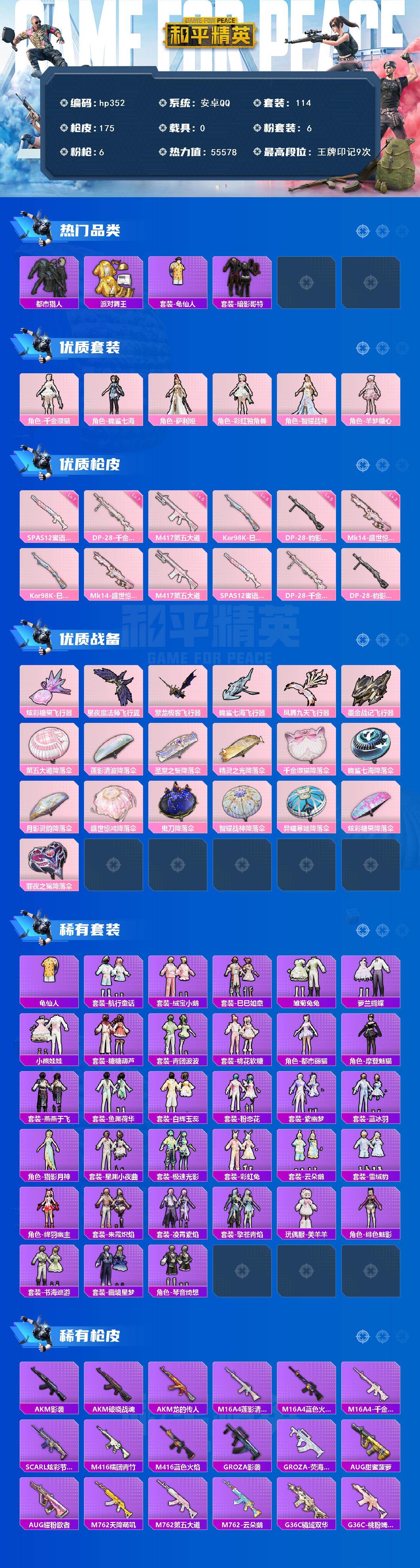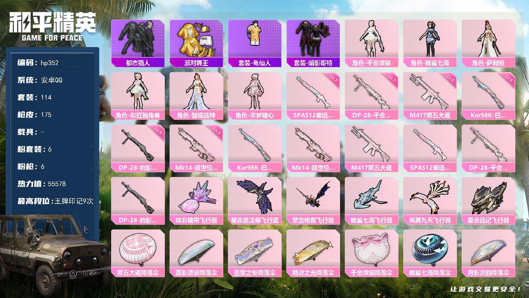 [17017953]安卓 手Q-6粉装-6特效枪-0载具-7粉色飞行器-55578热力值-9王牌印记-114套装-175枪皮 【热门品类】:套装-都市猎人,套装-派对舞王,套装-龟仙人,套装-暗影哥特 【粉色套装】:角色-千金淑猫,角色-脆鲨七海,角色-萨利娅,角色-彩虹独角兽,角色-智耀战神,角色-羊梦糖心 【粉色枪皮等级】:Kar98K-巳巳如意(五级),Mk14-盛世惊鸿(三级),M417-第五大道(五级),SPAS-12-蜜语绒猫(七级),DP-28-千金淑猫(七级),DP-28-豹影疾电(五级) 【粉色枪皮】:Kar98K-巳巳如意,Mk14-盛世惊鸿,M417-第五大道,SPAS-12-蜜语绒猫,DP-28-千金淑猫,DP-28-豹影疾电 【粉色飞行器】:炫彩糖果飞行器,星夜魔法师飞行翼,繁龙极客飞行器,脆鲨七海飞行器,凤舞九天飞行器,墨金战记飞行器 【粉色降落伞】:第五大道降落伞,莲影清波降落伞,圣堂之誓降落伞,精灵之光降落伞,千金淑猫降落伞,脆鲨七海降落伞,月影灵韵降落伞,盛世惊鸿降落伞,鬼刀降落伞,智耀战神降落伞,异瞳寒姬降落伞,炫彩糖果降落伞,罪夜之冕降落伞 【稀有套装】:套装-龟仙人,套装-航行童话,套装-绒宝小鹅,套装-巳巳如意,套装-雪国风尚,套装-炫彩糖果,套装-雏菊兔兔,套装-萝兰蝴蝶,套装-小熊娃娃,套装-糖糖葫芦,套装-青团波波,套装-棉花软糖,角色-都市丽猫,角色-摩登魅猫,套装-燕燕于飞,套装-鱼渊荷华,套装-白辉玉蕊,套装-粉恋花,套装-紫幽梦,套装-蓝冰羽,角色-猎影月神,套装-星渊小夜曲,套装-极速光影,套装-彩虹兔,套装-云朵鹅,套装-雪绒豹,角色-绛羽幽主,套装-朱霞炽焰,套装-凌霄紫焰,套装-擎苍青焰,玩偶服-美羊羊,角色-绯色魅影,套装-书海巡游,套装-画境星梦,套装-琴音绮想 【稀有枪皮】:AUG-冰晶雪宝,AKM-影袭,AKM-破晓战魂,AKM-龙的传人,M16A4-莲影清波,M16A4-蓝色火焰,M16A4-千金淑猫,SCAR-L-炫彩节奏,M416-糯团青竹,M416-蓝色火焰,GROZA-影袭,GROZA-荧海星豚,AUG-甜蜜菠萝,AUG-耀粉歌者,M762-天降萌叽,M762-第五大道,M762-云朵鹅,G36C-镜域双华,G36C-桃粉嫣然,G36C-星穹咏叹调,ACE32-画境星梦,ARX-凌霄紫焰,UZI-啾咪啾