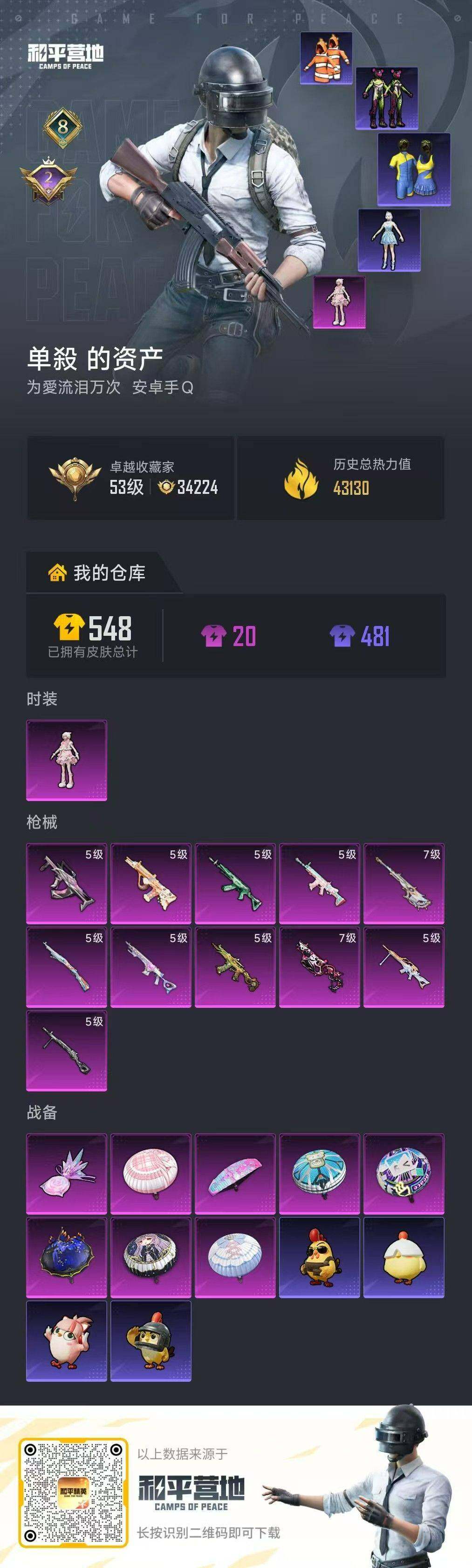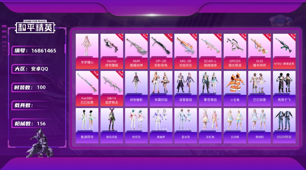 [16861465]安卓 手Q-1粉装-11特效枪-0载具-1粉色飞行器-43212热力值-8王牌印记-100套装-156枪皮