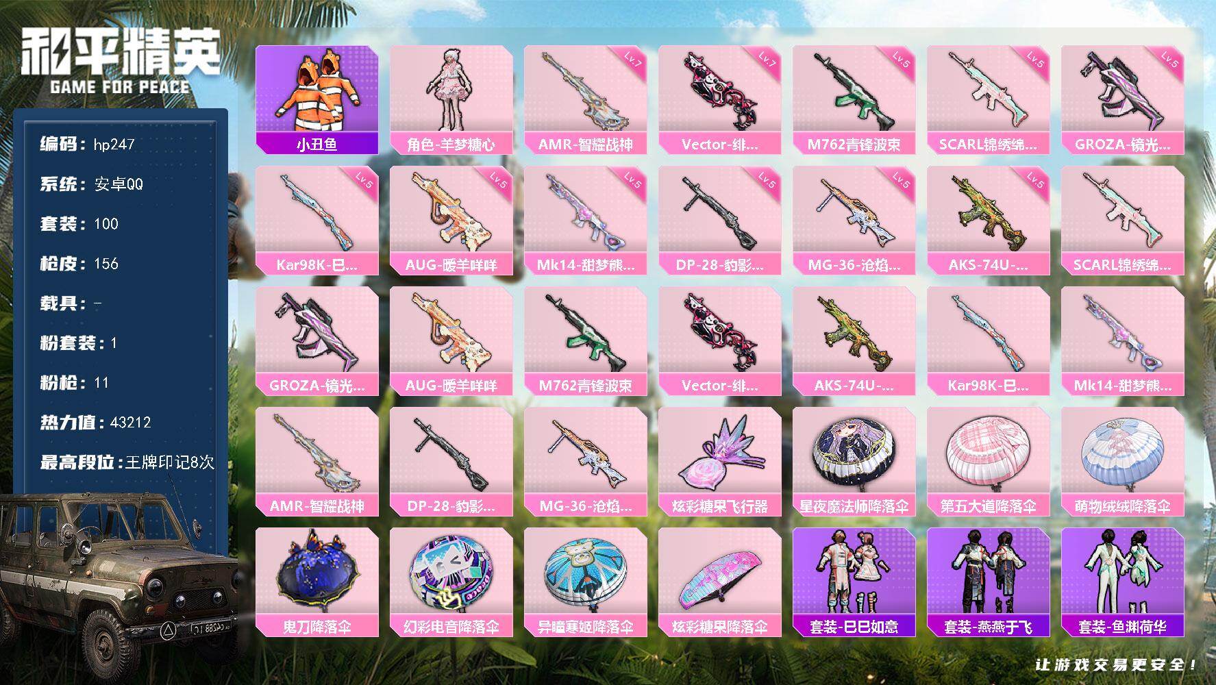 [16861465]安卓 手Q-1粉装-11特效枪-0载具-1粉色飞行器-43212热力值-8王牌印记-100套装-156枪皮 【热门品类】:套装-小丑鱼 【粉色套装】:角色-羊梦糖心 【粉色枪皮等级】:SCAR-L-锦绣绵绵(五级),GROZA-镜光银凌(五级),AUG-暖羊咩咩(五级),M762-青锋波束(五级),Vector-绯穹魔姬(七级),AKS-74U-森灵之息(五级),Kar98K-巳巳如意(五级),Mk14-甜梦熊击(五级),AMR-智耀战神(七级),DP-28-豹影疾电(五级),MG-36-沧焰双生(五级) 【粉色枪皮】:SCAR-L-锦绣绵绵,GROZA-镜光银凌,AUG-暖羊咩咩,M762-青锋波束,Vector-绯穹魔姬,AKS-74U-森灵之息,Kar98K-巳巳如意,Mk14-甜梦熊击,AMR-智耀战神,DP-28-豹影疾电,MG-36-沧焰双生 【粉色飞行器】:炫彩糖果飞行器 【粉色降落伞】:星夜魔法师降落伞,第五大道降落伞,萌物绒绒降落伞,鬼刀降落伞,幻彩电音降落伞,异瞳寒姬降落伞,炫彩糖果降落伞 【稀有套装】:套装-巳巳如意,套装-雪国风尚,套装-炫彩糖果,套装-燕燕于飞,套装-鱼渊荷华,套装-旋风灵鼠,套装-粉恋花,套装-紫幽梦,套装-蓝冰羽,套装-彩虹兔,套装-云朵鹅,套装-雪绒豹,套装-朱霞炽焰,套装-凌霄紫焰,套装-擎苍青焰,角色-绯色魅影,套装-红釉青花 【稀有枪皮】:AUG-冰晶雪宝,AKM-霓虹街区,AKM-龙的传人,M16A4-幻世战舞者,SCAR-L-夜灯,SCAR-L-炫彩节奏,SCAR-L-玉兔迎春,M416-糯团青竹,M416-红色方程式,GROZA-影袭,AUG-天降萌叽,AUG-耀粉歌者,M762-云朵鹅,G36C-桃粉嫣然,G36C-星穹咏叹调,蜜獾-天降萌叽,ARX-凌霄紫焰,UZI-啾咪啾咪,UZI-天降萌叽,UMP45-夜灯,UMP45-炫光之旅,Vector-生命誓言,Vector-创世·救赎,汤姆逊-炫彩节奏,汤姆逊-环太平洋,JS9-凌霄紫焰,P90-巳巳如意,Kar98K-彩虹符号,Kar98K-影袭,Mini14-穿刺龙虾,M417-惊鸿侠骨,M200-惊鸿侠骨,SVD-云朵鹅,S12K-玩趣呆呆,S12K-夜灯,S12K-极意拳锋,DBS-第五大道,SPAS-12-云朵鹅,M249-彩虹符号,M249-