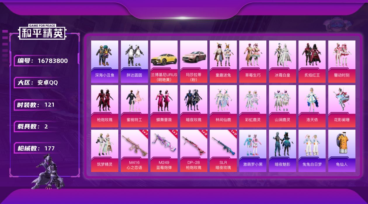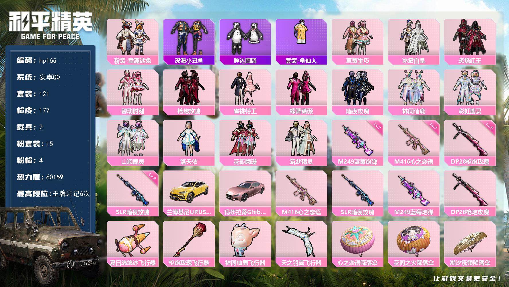 [16783800]安卓 手Q-15粉装-4特效枪-2载具-5粉色飞行器-60159热力值-6王牌印记-121套装-177枪皮 【热门品类】:粉装-童趣迷兔,套装-深海小丑鱼,套装-胖达圆圆,套装-龟仙人 【粉色套装】:粉装-草莓生巧,粉装-冰霜白皇,粉装-童趣迷兔,粉装-炙焰红王,粉装-馨动时刻,粉装-枪炮玫瑰,粉装-蜜桃特工,粉装-蝶舞蔷薇,粉装-暗夜玫瑰,粉装-林间仙鹿,粉装-彩虹鹿灵,粉装-山涧鹿灵,角色-洛天依,粉装-花影阑珊,粉装-筑梦精灵 【粉色枪皮等级】:M416-心之恋语(七级),SLR-暗夜玫瑰(二级),M249-蓝莓炮弹(七级),DP-28-枪炮玫瑰(五级) 【粉色载具】:兰博基尼URUS(明艳黄),玛莎拉蒂Ghibli(粉) 【粉色枪皮】:M416-心之恋语,SLR-暗夜玫瑰,M249-蓝莓炮弹,DP-28-枪炮玫瑰 【粉色飞行器】:炫彩糖果飞行器,夏日绵绵冰飞行器,枪炮玫瑰飞行器,林间仙鹿飞行器,天之羽翼飞行器 【粉色降落伞】:心之恋语降落伞,花间之火降落伞,潮汐统领降落伞,夏日绵绵冰降落伞,童趣迷兔降落伞,梦之光华降落伞,烈焰拳霸降落伞,枪炮玫瑰降落伞,暗夜玫瑰降落伞,林间仙鹿降落伞,洛神天依降落伞,海渊国主降落伞,蓝莓炮弹降落伞,流星咚咚降落伞,炙焰牛王降落伞,炫彩糖果降落伞 【稀有套装】:套装-龟仙人,套装-雪国风尚,套装-炫彩糖果,角色-俏兔智灵 【稀有枪皮】:AKM-冰凉西瓜,AKM-彩虹符号,AKM-海渊国主,AKM-灼热熔岩,AKM-破晓战魂,AKM-萌趣颜团子,AKM-虎虎生威,AKM-霓虹街区,M16A4-幻世战舞者,M16A4-机械英豪,M16A4-甜心亚梦,SCAR-L-夏日绵绵冰,SCAR-L-暗夜玫瑰,SCAR-L-炫彩节奏,SCAR-L-玉兔迎春,SCAR-L-红色方程式,SCAR-L-龙宫之主,M416-红色方程式,M416-绯红前夜,M416-葫芦兄弟,M416-蓝色火焰,GROZA-异彩先驱,GROZA-懵萌河马,GROZA-林间仙鹿,GROZA-蓝莓炮弹,AUG-天降萌叽,AUG-耀粉歌者,AUG-绝对恒星,QBZ-彩虹符号,QBZ-洛神天依,QBZ-电玩视界,QBZ-飞驰魅影,M762-拳皇97,M762-枪炮玫瑰,M762-深海曼妙,M762-烈焰拳霸,M762-牛气冲天,M762-瑞龙福将,Mk47-林间仙鹿,Mk4