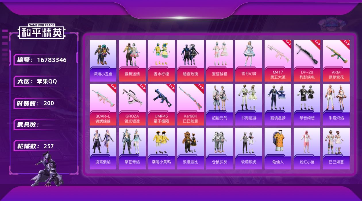 - [9778539]实名: 可修改 时装数: 815 枪械数: 219 战备数: 168 热门装扮: 梦幻火箭(新101),极限特训,怪诞乔克,宝贝奶油派,放客神游,鹰眼刺客,缤纷油彩,粉色回忆,都市猎人,香水柠檬,炙焰红王,花间之火,冰霜白皇,虎啸骄阳,迪迦闪耀型,零号机款机体服,初号机款机体服,2号机款机体服,甜梦小狐,暖熊萌萌,灵感创作师,冰川幽秘,动感兔斯基,音爆索尼克,赤蝎幽灵,派对舞王,萨利娅 稀有枪皮: MG3洛神天依,Vector红伞翩翩,AKM甜心宝贝,M416心之恋语,SCAR-L童趣迷兔,Groza香水柠檬,DP-28枪炮玫瑰,M416暖熊萌萌,SPAS-12音爆索尼克,平底锅林间仙鹿,Kar98K-巳巳如意,MK12-雪月幻音