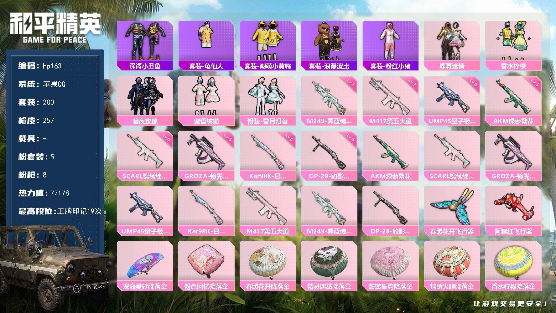 [16783346]苹果 手Q-5粉装-8特效枪-0载具-4粉色飞行器-77178热力值-19王牌印记-200套装-257枪皮
