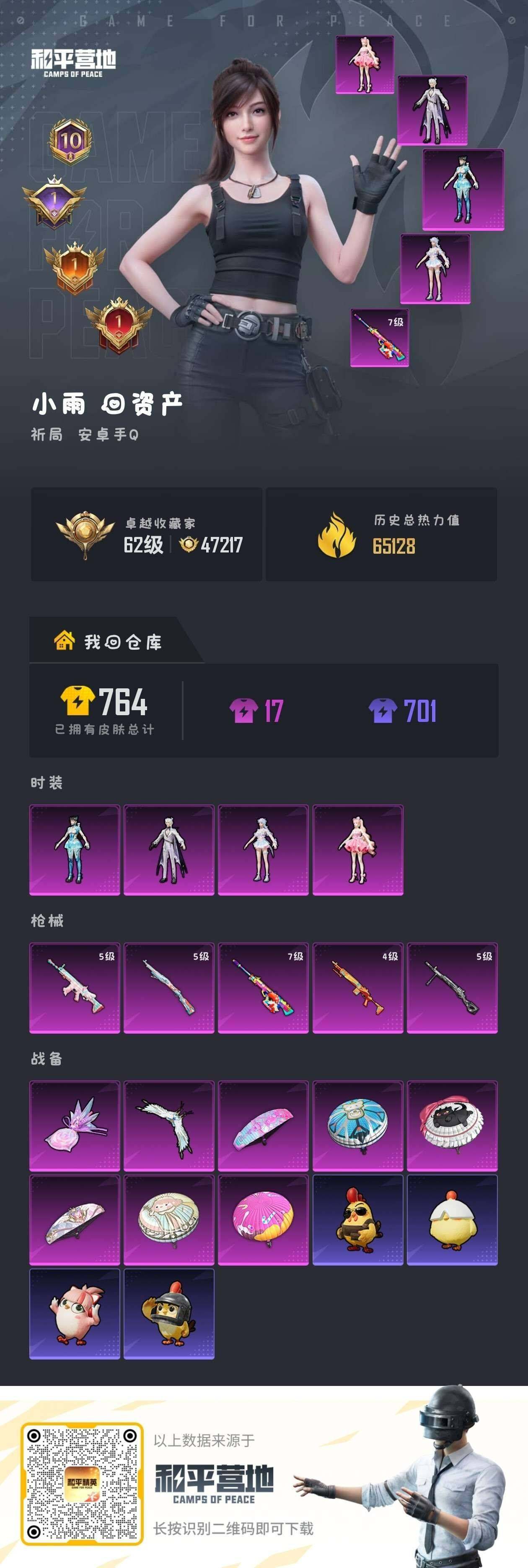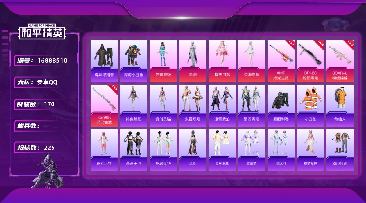 [16888510]安卓 手Q-4粉装-5特效枪-0载具-2粉色飞行器-65148热力值-10王牌印记-170套装-225枪皮