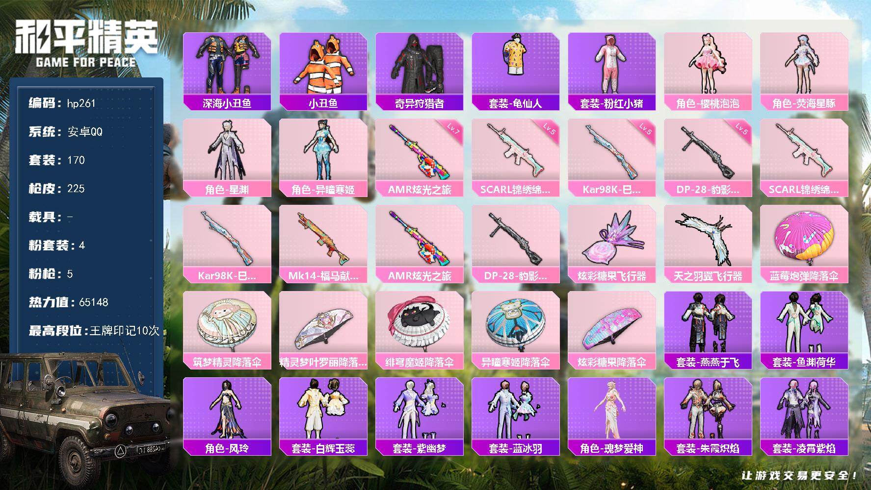 [16888510]安卓 手Q-4粉装-5特效枪-0载具-2粉色飞行器-65148热力值-10王牌印记-170套装-225枪皮 【热门品类】:套装-深海小丑鱼,套装-小丑鱼,套装-奇异狩猎者,套装-龟仙人,套装-粉红小猪 【粉色套装】:角色-樱桃泡泡,角色-荧海星豚,角色-星渊,角色-异瞳寒姬 【粉色枪皮等级】:SCAR-L-锦绣绵绵(五级),Kar98K-巳巳如意(五级),AMR-炫光之旅(七级),DP-28-豹影疾电(五级) 【粉色枪皮】:SCAR-L-锦绣绵绵,Kar98K-巳巳如意,Mk14-福马献瑞,AMR-炫光之旅,DP-28-豹影疾电 【粉色飞行器】:炫彩糖果飞行器,天之羽翼飞行器 【粉色降落伞】:蓝莓炮弹降落伞,筑梦精灵降落伞,精灵梦叶罗丽降落伞,绯穹魔姬降落伞,异瞳寒姬降落伞,炫彩糖果降落伞 【稀有套装】:套装-龟仙人,套装-雪国风尚,套装-炫彩糖果,套装-燕燕于飞,套装-鱼渊荷华,角色-风玲,套装-白辉玉蕊,套装-紫幽梦,套装-蓝冰羽,角色-瑰梦爱神,套装-朱霞炽焰,套装-凌霄紫焰,套装-擎苍青焰,角色-绯色魅影,角色-紫俏灵猫 【稀有枪皮】:AUG-冰晶雪宝,AKM-夜灯,AKM-灼热熔岩,AKM-环太平洋,AKM-生命誓言,AKM-百万伏特,AKM-破晓战魂,AKM-缤纷海域,AKM-萌趣颜团子,AKM-虎虎生威,AKM-龙的传人,M16A4-夜灯,M16A4-幻世战舞者,M16A4-甜心亚梦,M16A4-红色方程式,M16A4-蓝色火焰,SCAR-L-夜灯,SCAR-L-炫彩节奏,SCAR-L-玉兔迎春,SCAR-L-红色方程式,M416-月影鸳鸯,M416-糯团青竹,M416-红色方程式,M416-绯红前夜,M416-蓝色火焰,GROZA-异彩先驱,GROZA-彩虹符号,GROZA-影袭,GROZA-田园牧歌,AUG-耀粉歌者,AUG-青春冒险家,QBZ-彩虹符号,M762-天降萌叽,M762-瑞龙福将,M762-第五大道,M762-绯红前夜,Mk47-妙红点点,Mk47-洛神天依,Mk47-炫光之旅,Mk47-青春冒险家,AC-VAL-天降萌叽,AC-VAL-快闪甜心,AC-VAL-甜心亚梦,蜜獾-垂柳戏鸭,蜜獾-天降萌叽,蜜獾-娇憨猪猪,ARX-凌霄紫焰,UZI-啾咪啾咪,UZI-天降萌叽,UZI-娇憨猪猪,UZI-影袭,UZI-炫彩节奏,UZI-红色