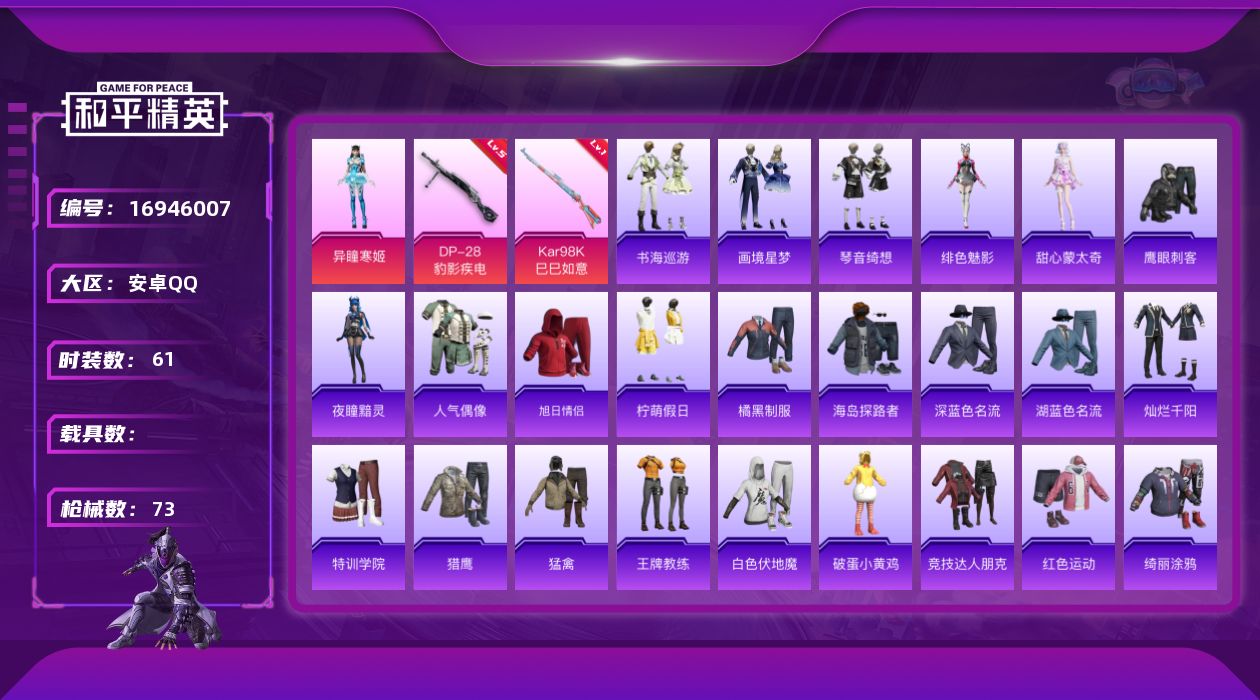 [16946007]安卓 手Q-1粉装-3特效枪-0载具-1粉色飞行器-17390热力值-4王牌印记-61套装-73枪皮 【粉色套装】:角色-异瞳寒姬 【粉色枪皮等级】:Kar98K-巳巳如意(一级),DP-28-豹影疾电(五级) 【粉色枪皮】:Kar98K-巳巳如意,Mk14-福马献瑞,DP-28-豹影疾电 【粉色飞行器】:炫彩糖果飞行器 【粉色降落伞】:绝对恒星降落伞,极意拳锋降落伞,炫彩糖果降落伞 【稀有套装】:角色-甜心蒙太奇,套装-雪国风尚,套装-炫彩糖果,角色-夜瞳黯灵,角色-绯色魅影,套装-书海巡游,套装-画境星梦,套装-琴音绮想 【稀有枪皮】:AUG-冰晶雪宝,AKM-破晓战魂,SCAR-L-夜灯,SCAR-L-炫彩节奏,SCAR-L-玉兔迎春,SCAR-L-红色方程式,M416-蓝色火焰,GROZA-影袭,AUG-耀粉歌者,AUG-绝对恒星,QBZ-洛神天依,M762-彩虹符号,M762-登顶巅峰,AC-VAL-闲梦青缨,ACE32-画境星梦,UZI-影袭,UMP45-生命誓言,汤姆逊-耀粉歌者,MP5K-画境星梦,Kar98K-彩虹符号,M24-影袭,M1加兰德-画境星梦,S12K-破晓战魂,S12K-夜灯,AA12-G-画境星梦,M249-彩虹符号,MG3-幻世战舞者,突击盾牌-绝对恒星,平底锅-画境星梦 【其他套装】:套装-人气偶像,套装-旭日情侣,套装-柠萌假日,套装-橘黑制服,套装-海岛探路者,套装-深蓝色名流,套装-湖蓝色名流,套装-灿烂千阳,套装-特训学院,套装-猎鹰,套装-猛禽,套装-王牌教练,套装-白色伏地魔,套装-破蛋小黄鸡,套装-竞技达人朋克,套装-红色运动,套装-绮丽涂鸦,套装-缤纷果语,套装-蓝色运动,套装-街头潮人,套装-酒红色名流,套装-青年教官,套装-魅力单车,套装-黄色伏地魔,套装-黄色名流,套装-黄色运动,套装-黑色伏地魔,套装-鹰眼刺客,套装-冰冻风暴,套装-漫步者 【营地ID】:1015972328