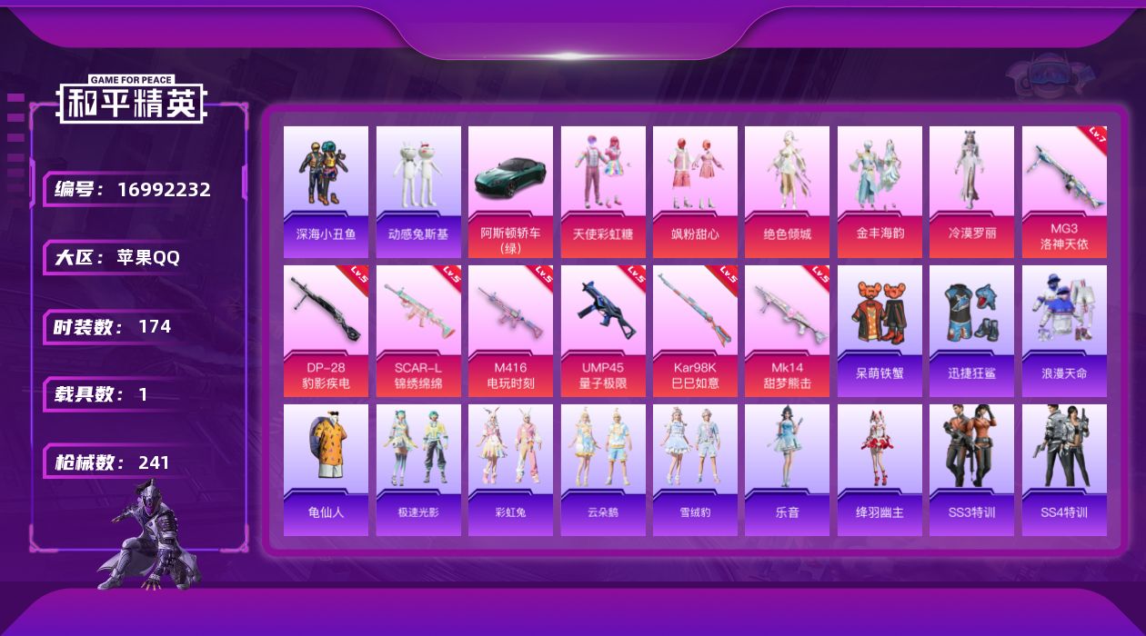 [16992232]苹果 手Q-5粉装-7特效枪-1载具-4粉色飞行器-70918热力值-9王牌印记-174套装-241枪皮
