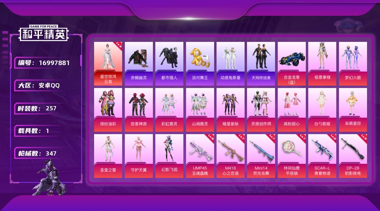 [16997881]安卓 手Q-无敌战神框-1神装-14粉装-15特效枪-1载具-6粉色飞行器-120892热力值-32王牌印记-257套装-347枪皮