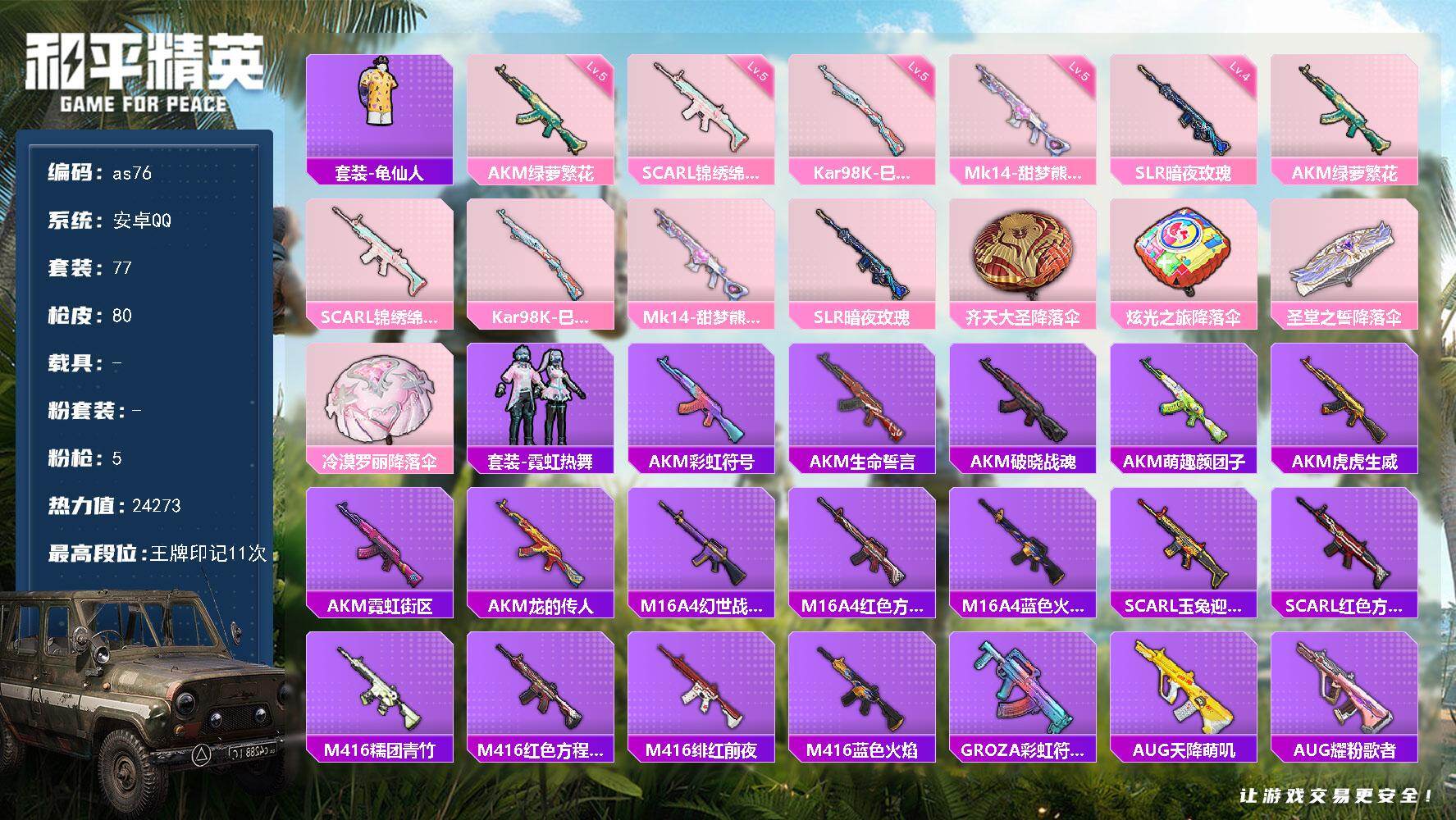 [16975196]安卓 手Q-0粉装-5特效枪-0载具-0粉色飞行器-24273热力值-11王牌印记-77套装-80枪皮