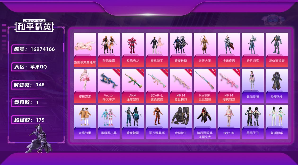 [16974166]苹果 手Q-9粉装-6特效枪-1载具-3粉色飞行器-56517热力值-3王牌印记-148套装-175枪皮