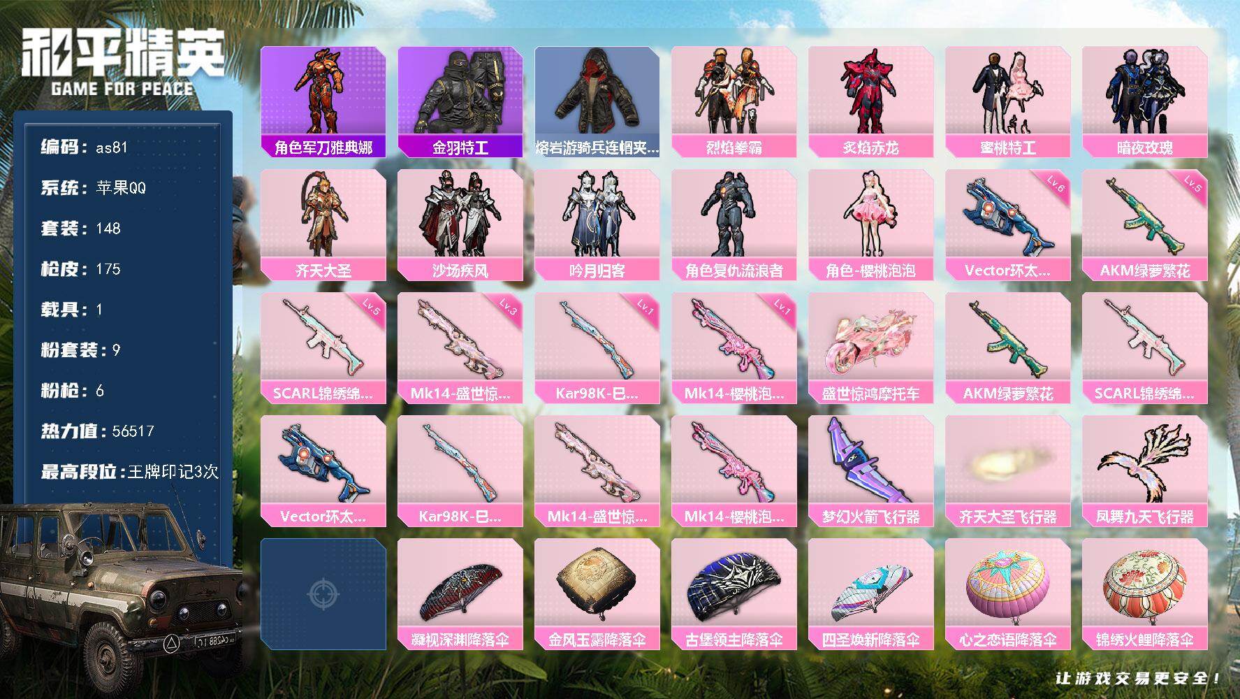 [16974166]苹果 手Q-9粉装-6特效枪-1载具-3粉色飞行器-56517热力值-3王牌印记-148套装-175枪皮 【热门品类】:角色-军刀雅典娜,套装-金羽特工,熔岩游骑兵连帽夹克 【粉色套装】:粉装-烈焰拳霸,粉装-炙焰赤龙,粉装-蜜桃特工,粉装-暗夜玫瑰,粉装-齐天大圣,粉装-沙场疾风,粉装-吟月归客,角色-复仇流浪者,角色-樱桃泡泡 【粉色枪皮等级】:AKM-绿萝繁花(五级),SCAR-L-锦绣绵绵(五级),Vector-环太平洋(六级),Kar98K-巳巳如意(一级),Mk14-盛世惊鸿(三级),Mk14-樱桃泡泡(一级) 【粉色载具】:盛世惊鸿摩托车 【粉色枪皮】:AKM-绿萝繁花,SCAR-L-锦绣绵绵,Vector-环太平洋,Kar98K-巳巳如意,Mk14-盛世惊鸿,Mk14-樱桃泡泡 【粉色飞行器】:梦幻火箭飞行器,齐天大圣飞行器,凤舞九天飞行器 【粉色降落伞】:绝对恒星降落伞,凝视深渊降落伞,金风玉露降落伞,古堡领主降落伞,四圣焕新降落伞,心之恋语降落伞,锦绣火鲤降落伞,王牌四分卫降落伞,齐天大圣降落伞,风花雪月降落伞,蓝莓炮弹降落伞,环太平洋降落伞,闲梦青缨降落伞,盛世惊鸿降落伞,樱桃泡泡降落伞,雪月幻音降落伞 【稀有套装】:套装-绒宝小鹅,套装-雪国风尚,套装-燕燕于飞,套装-鱼渊荷华,角色-蜜桃派对,套装-樱梦幻音,套装-蓝冰羽,角色-紫俏灵猫 【稀有枪皮】:AKM-夜灯,AKM-彩虹符号,AKM-环太平洋,AKM-生命誓言,AKM-破晓战魂,AKM-虎虎生威,AKM-霓虹街区,AKM-龙的传人,M16A4-幻世战舞者,M16A4-红色方程式,SCAR-L-炫彩节奏,SCAR-L-红色方程式,M416-快乐主宰,M416-糯团青竹,M416-红色方程式,M416-蓝色火焰,GROZA-异彩先驱,GROZA-黑色刀锋,AUG-耀粉歌者,QBZ-原初圣火,QBZ-彩虹符号,QBZ-洛神天依,QBZ-神秘黑猫,M762-深海曼妙,M762-牛气冲天,M762-瑞龙福将,M762-镭射皇者,M762-风花雪月,Mk47-洛神天依,Mk47-炫光之旅,G36C-古战神甲,G36C-暗夜玫瑰,G36C-金风玉露,AC-VAL-天降萌叽,AC-VAL-快闪甜心,AC-VAL-甜心亚梦,AC-VAL-闲梦青缨,UZI-天降萌叽,UZI-炫彩节奏,UZI-红色方程