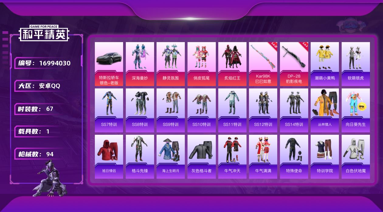 [16994030]安卓 手Q-4粉装-2特效枪-1载具-0粉色飞行器-27888热力值-1王牌印记-67套装-94枪皮 【热门品类】:套装-潮萌小黄鸭 【粉色套装】:粉装-深海曼妙,粉装-静灵氛围,粉装-俏皮狐尾,粉装-炙焰红王 【粉色枪皮等级】:Kar98K-巳巳如意(二级),DP-28-豹影疾电(一级) 【粉色载具】:特斯拉Model 3(冷光银) 【粉色枪皮】:Kar98K-巳巳如意,DP-28-豹影疾电 【粉色降落伞】:金风玉露降落伞,龙虾霸霸降落伞,PEL轰鸣竞梦者降落伞,神秘黑猫降落伞,炫彩糖果降落伞 【稀有套装】:套装-雪国风尚 【稀有枪皮】:AKM-玉龙,AKM-破晓战魂,AKM-阿狸红,M16A4-红色方程式,SCAR-L-炫彩节奏,SCAR-L-红色方程式,M416-夜灯,M416-红色方程式,M416-蓝色火焰,M416-魔法学院,GROZA-治愈之星,GROZA-黑色刀锋,AUG-耀粉歌者,QBZ-原初圣火,QBZ-彩虹符号,QBZ-赛罗,M762-动感兔斯基,M762-奇异狩猎者,M762-牛气冲天,G36C-不夜海上花,G36C-暗夜玫瑰,G36C-金风玉露,AC-VAL-天降萌叽,UZI-众神之王,UZI-古堡领主,UZI-金风玉露,UMP45-天启纪元,UMP45-快乐主宰,Vector-彩虹符号,Vector-治愈之星,Vector-生命誓言,Vector-黑色刀锋,汤姆逊-勇闯险境,汤姆逊-林间仙鹿,野牛-机械英豪,MP5K-众神之王,MP5K-梨园星光,P90-巳巳如意,Kar98K-勇闯险境,M24-治愈之星,M24-众神之王,M24-奇异狩猎者,AWM-不夜海上花,SKS-勇闯险境,SKS-炫彩节奏,VSS-黑色刀锋,Mini14-原初圣火,Mini14-炫彩节奏,Mini14-金鼠迎春,Mk14-治愈之星,Win94-机械英豪,SLR-众神之王,SLR-沙漠守护者,QBU-不夜海上花,S686-不夜海上花,S686-红色方程式,S1897-勇闯险境,S1897-神秘黑猫,S12K-破晓战魂,S12K-机械英豪,S12K-极意拳锋,M249-四圣焕新,M249-破晓战魂,DP-28-原初圣火,MG3-幻世战舞者,P18C-原初圣火 【其他套装】:套装-SS7特训,套装-SS8特训,套装-SS9特训,套装-SS10特训,套装-SS11特训,套