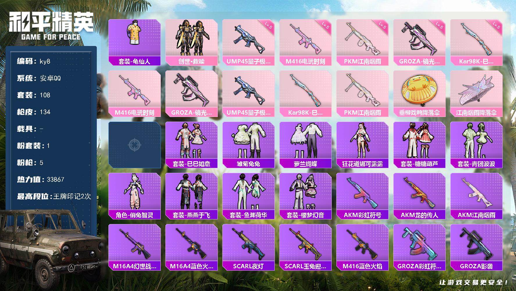 [16974639]安卓 手Q-1粉装-5特效枪-0载具-0粉色飞行器-33867热力值-2王牌印记-108套装-134枪皮 【热门品类】:套装-龟仙人 【粉色套装】:套装-创世·救赎 【粉色枪皮等级】:M416-电玩时刻(五级),GROZA-镜光银凌(五级),UMP45-量子极限(五级),Kar98K-巳巳如意(五级),PKM-江南烟雨(五级) 【粉色枪皮】:M416-电玩时刻,GROZA-镜光银凌,UMP45-量子极限,Kar98K-巳巳如意,PKM-江南烟雨 【粉色降落伞】:垂柳戏鸭降落伞,江南烟雨降落伞,炫彩糖果降落伞 【稀有套装】:套装-龟仙人,套装-巳巳如意,套装-雏菊兔兔,套装-萝兰蝴蝶,角色-狂花道·娜可露露,套装-糖糖葫芦,套装-青团波波,角色-俏兔智灵,套装-燕燕于飞,套装-鱼渊荷华,套装-樱梦幻音 【稀有枪皮】:AKM-彩虹符号,AKM-江南烟雨,AKM-龙的传人,M16A4-幻世战舞者,M16A4-蓝色火焰,SCAR-L-夜灯,SCAR-L-玉兔迎春,M416-蓝色火焰,GROZA-彩虹符号,GROZA-影袭,AUG-天降萌叽,AUG-甜蜜菠萝,AUG-耀粉歌者,QBZ-彩虹符号,M762-彩虹符号,AC-VAL-天降萌叽,蜜獾-天降萌叽,蜜獾-娇憨猪猪,UZI-天降萌叽,UZI-娇憨猪猪,UMP45-夜灯,UMP45-生命誓言,UMP45-蓝色火焰,Vector-焰鹰斗篷,汤姆逊-天降萌叽,汤姆逊-耀粉歌者,AKS-74U-鬼刀,P90-金蛇镇世,P90-巳巳如意,Kar98K-彩虹符号,M24-炫彩节奏,AWM-焰鹰斗篷,SKS-炫彩节奏,VSS-彩虹符号,Mini14-梦幻火箭,Mini14-炫彩节奏,Mini14-耀粉歌者,Mini14-镭金极速,SLR-娇憨猪猪,AMR-鬼刀,S686-彩虹符号,S686-生命誓言,S686-红色方程式,S686-巳巳如意,S1897-炫彩节奏,S12K-玩趣呆呆,S12K-夜灯,S12K-娇憨猪猪,DBS-焰鹰斗篷,M249-彩虹符号,M249-破晓战魂,DP-28-焰鹰斗篷,TMP-9-江南烟雨,战术弩-江南烟雨,大砍刀-黑金刀,大砍刀-鬼刀,破片手榴弹-巳巳如意 【其他套装】:套装-SS21特训,套装-SS22特训,套装-SS23特训,套装-SS25特训,套装-SS27特训,套装-SS28特训,套装-SS29特