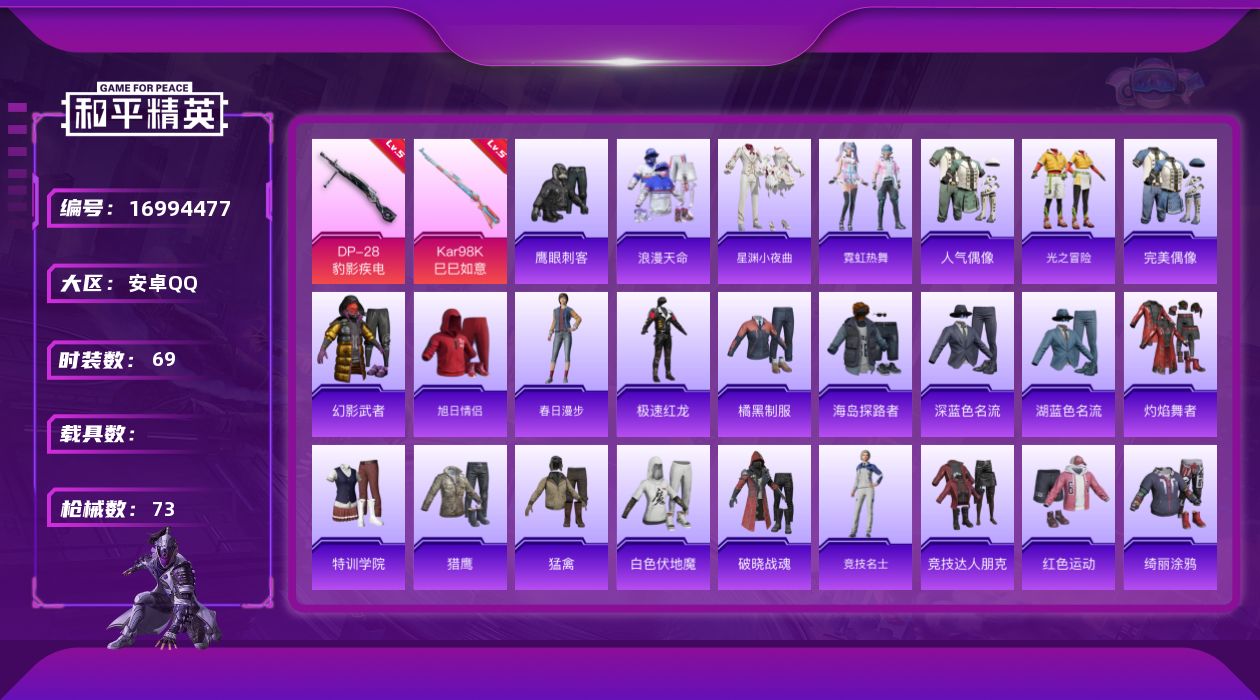 [16994477]安卓 手Q-0粉装-4特效枪-0载具-2粉色飞行器-17849热力值-4王牌印记-69套装-73枪皮