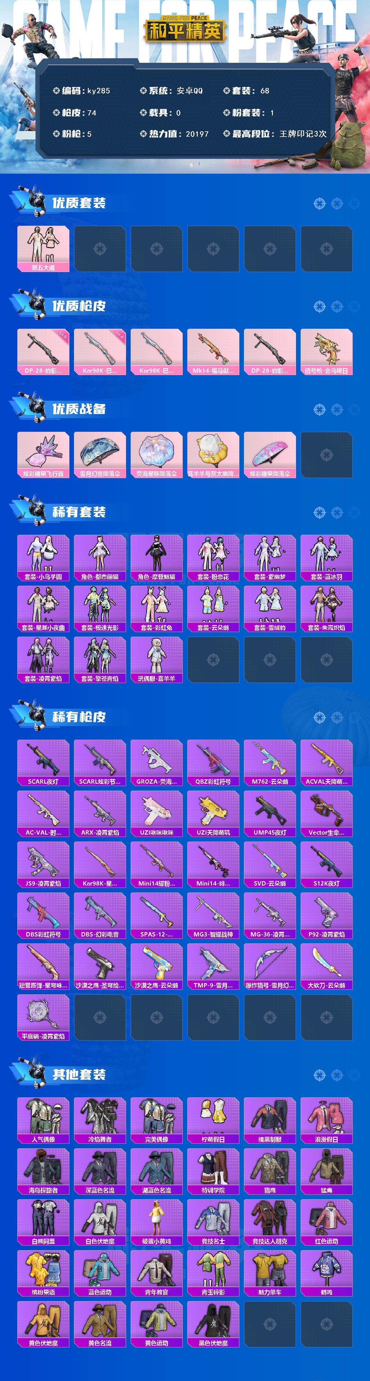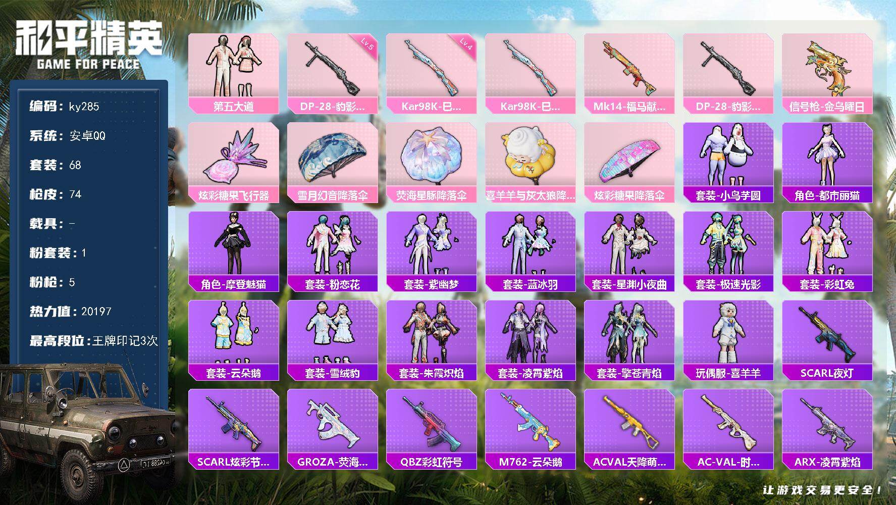 [16946183]安卓 手Q-1粉装-5特效枪-0载具-1粉色飞行器-20197热力值-3王牌印记-68套装-74枪皮 【粉色套装】:粉装-第五大道 【粉色枪皮等级】:Kar98K-巳巳如意(四级),DP-28-豹影疾电(五级) 【粉色枪皮】:Kar98K-巳巳如意,Mk14-福马献瑞,DP-28-豹影疾电,信号枪-金乌曜日 【粉色飞行器】:炫彩糖果飞行器 【粉色降落伞】:雪月幻音降落伞,荧海星豚降落伞,喜羊羊与灰太狼降落伞,炫彩糖果降落伞 【稀有套装】:套装-小鸟芋圆,角色-都市丽猫,角色-摩登魅猫,套装-粉恋花,套装-紫幽梦,套装-蓝冰羽,套装-星渊小夜曲,套装-极速光影,套装-彩虹兔,套装-云朵鹅,套装-雪绒豹,套装-朱霞炽焰,套装-凌霄紫焰,套装-擎苍青焰,玩偶服-喜羊羊 【稀有枪皮】:SCAR-L-夜灯,SCAR-L-炫彩节奏,GROZA-荧海星豚,QBZ-彩虹符号,M762-云朵鹅,AC-VAL-天降萌叽,AC-VAL-时光之吻,ARX-凌霄紫焰,UZI-啾咪啾咪,UZI-天降萌叽,UMP45-夜灯,Vector-生命誓言,JS9-凌霄紫焰,Kar98K-星穹咏叹调,Mini14-耀粉歌者,Mini14-绯穹魔姬,SVD-云朵鹅,S12K-夜灯,DBS-彩虹符号,DBS-幻彩电音,SPAS-12-云朵鹅,MG3-智耀战神,MG-36-凌霄紫焰,P92-凌霄紫焰,短管霰弹-星穹咏叹调,沙漠之鹰-云朵鹅,沙漠之鹰-圣穹绘梦,TMP-9-雪月幻音,爆炸猎弓-雪月幻音,大砍刀-云朵鹅,平底锅-凌霄紫焰 【其他套装】:套装-人气偶像,套装-冷焰舞者,套装-完美偶像,套装-柠萌假日,套装-橘黑制服,套装-浪漫假日,套装-海岛探路者,套装-深蓝色名流,套装-湖蓝色名流,套装-特训学院,套装-猎鹰,套装-猛禽,套装-白熊同盟,套装-白色伏地魔,套装-破蛋小黄鸡,套装-竞技名士,套装-竞技达人朋克,套装-红色运动,套装-缤纷果语,套装-蓝色运动,套装-青年教官,套装-青玉碎影,套装-魅力单车,套装-鹤鸣,套装-黄色伏地魔,套装-黄色名流,套装-黄色运动,套装-黑色伏地魔 【营地ID】:980364937