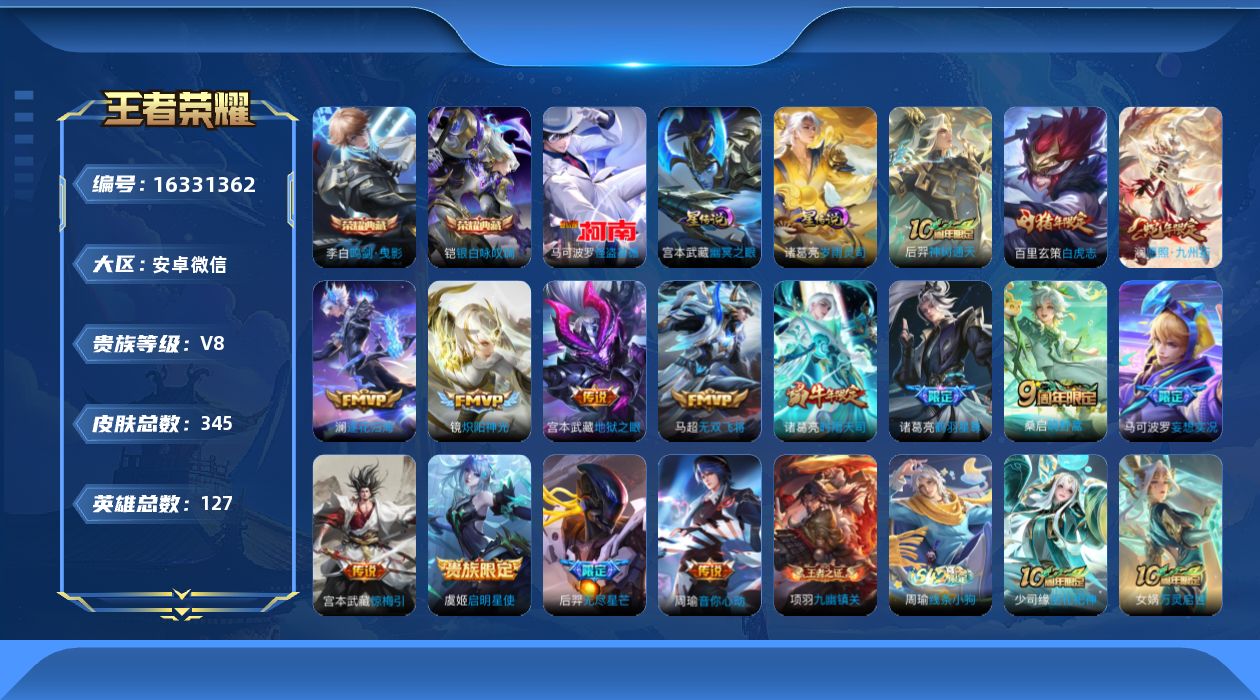[16331362]安卓WX-V8-至尊星耀I段位-127英雄-345皮肤-2典藏皮肤-1珍品传说-15传说-2星元-99史诗