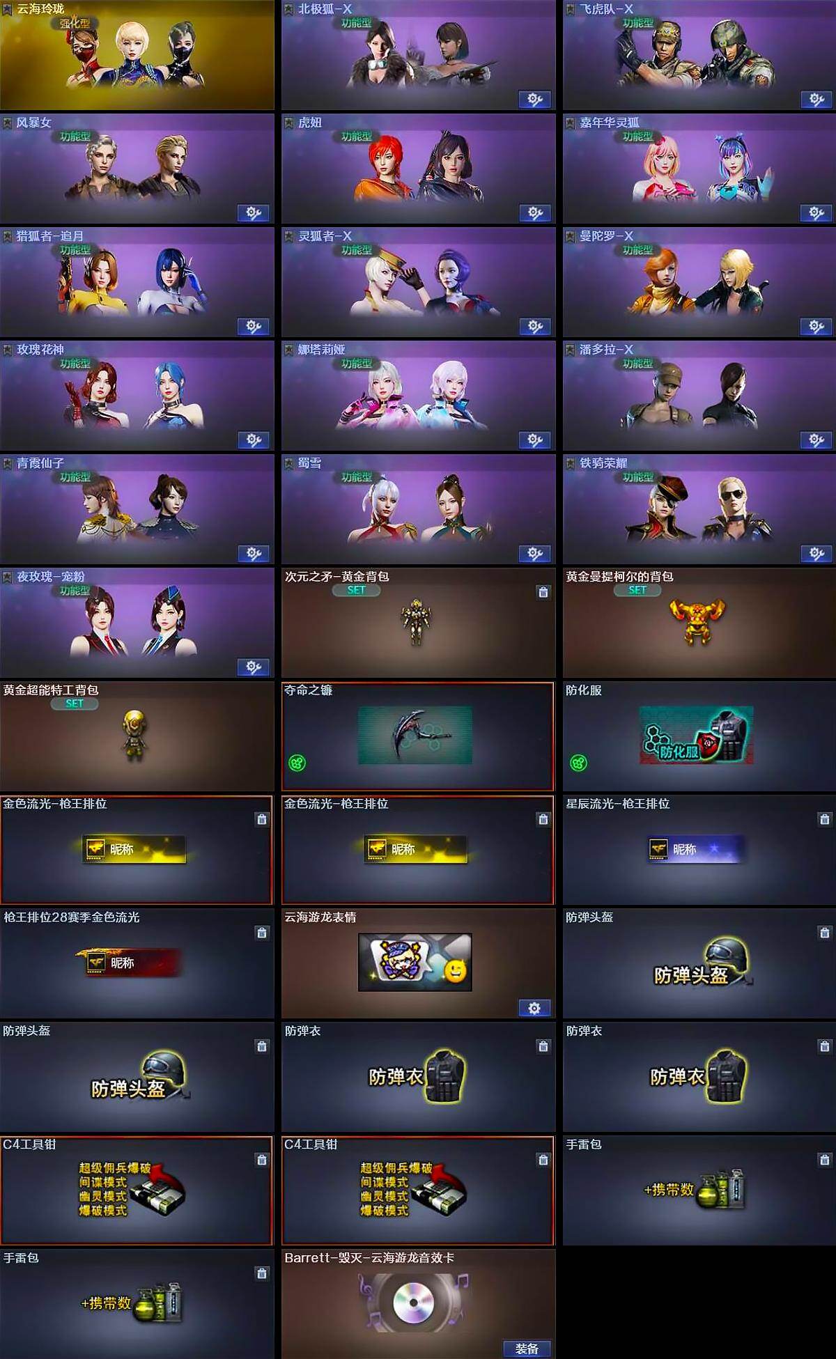 【道具】:次元之矛-黄金背包,黄金曼提柯尔的背包,黄金超能特工背包,夺命之镰,防化服,金色流光-枪王排位*2,星辰流光-枪王排位,枪王排位28赛季金色流光,云海游龙表情,防弹头盔*2,防弹衣*2,C4工具钳*2,手雷包*2