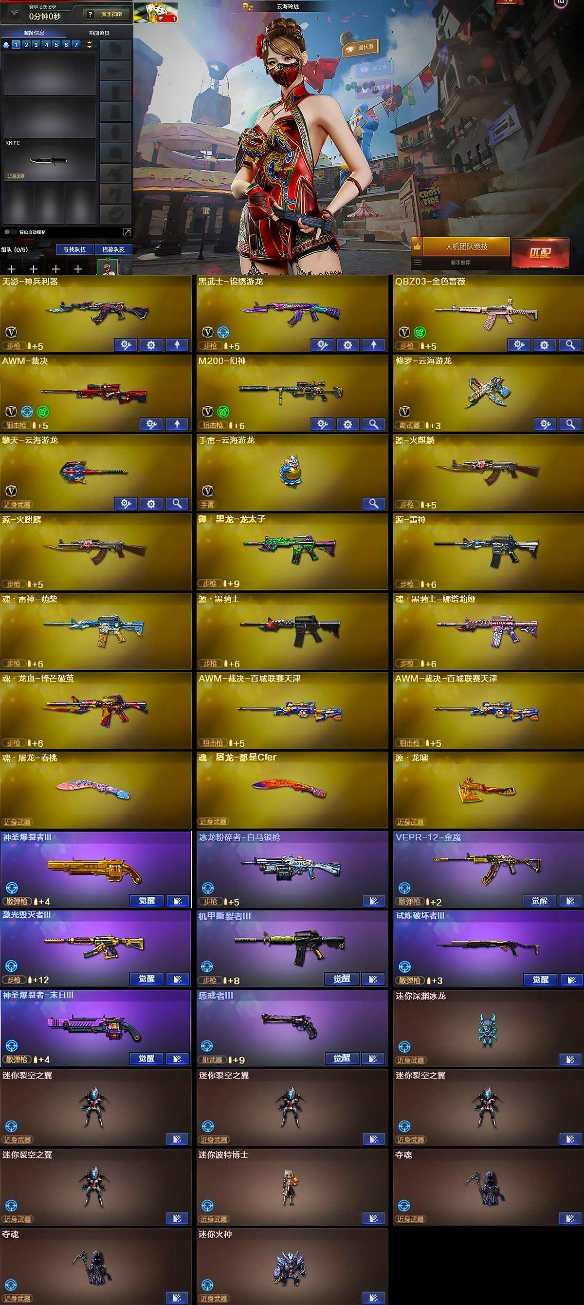 【英雄级武器】:无影-神兵利器,黑武士-锦绣游龙,QBZ03-金色蔷薇,AWM-裁决,M200-幻神,修罗-云海游龙,擎天-云海游龙,手雷-云海游龙