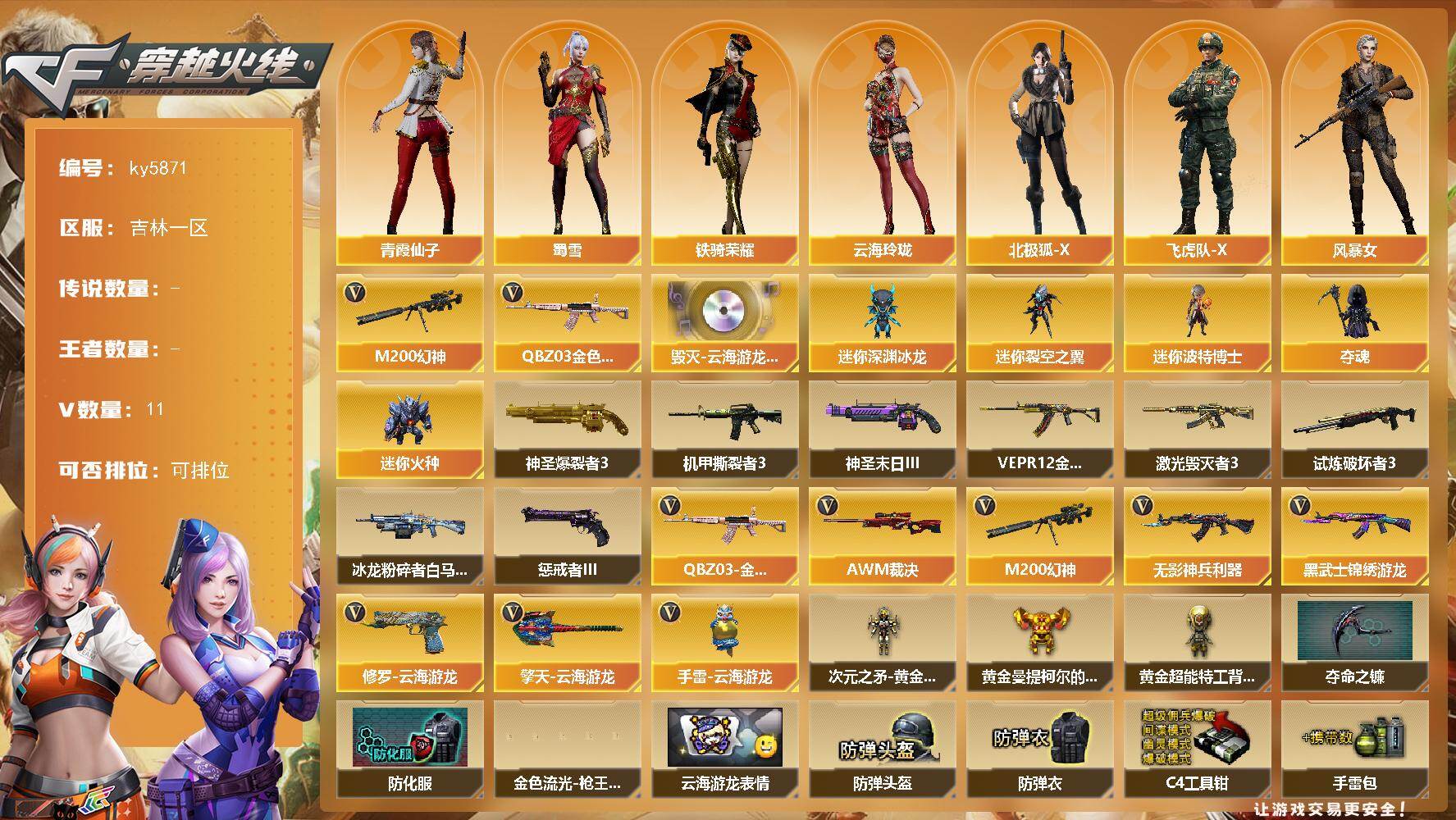 [17069633]吉林一区-11V-0王者武器数-0炫金武器数 【热门武器】:QBZ03-金色蔷薇,M200-幻神 【音效卡】:Barrett-毁灭-云海游龙音效卡 【角色】:云海玲珑,北极狐-X,飞虎队-X,风暴女,虎妞,嘉年华灵狐,猎狐者-追月,灵狐者-X,曼陀罗-X,玫瑰花神,娜塔莉娅,潘多拉-X,青霞仙子,蜀雪,铁骑荣耀,夜玫瑰-宠粉 【人偶武器】:迷你深渊冰龙,迷你裂空之翼*4,迷你波特博士,夺魂*2,迷你火种 【挑战大师】:神圣爆裂者III,冰龙粉碎者-白马银枪,VEPR-12-金魔,激光毁灭者III,机甲撕裂者III,试炼破坏者III,神圣爆裂者-末日III,惩戒者III 【英雄级武器】:无影-神兵利器,黑武士-锦绣游龙,QBZ03-金色蔷薇,AWM-裁决,M200-幻神,修罗-云海游龙,擎天-云海游龙,手雷-云海游龙 【道具】:次元之矛-黄金背包,黄金曼提柯尔的背包,黄金超能特工背包,夺命之镰,防化服,金色流光-枪王排位*2,星辰流光-枪王排位,枪王排位28赛季金色流光,云海游龙表情,防弹头盔*2,防弹衣*2,C4工具钳*2,手雷包*2 【特殊枪械】: