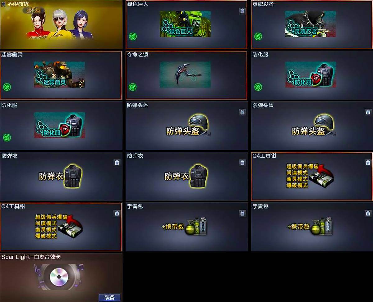 【道具】:绿色巨人,灵魂忍者,迷雾幽灵,夺命之镰,防化服*2,防弹头盔*2,防弹衣*2,C4工具钳*2,手雷包*2
