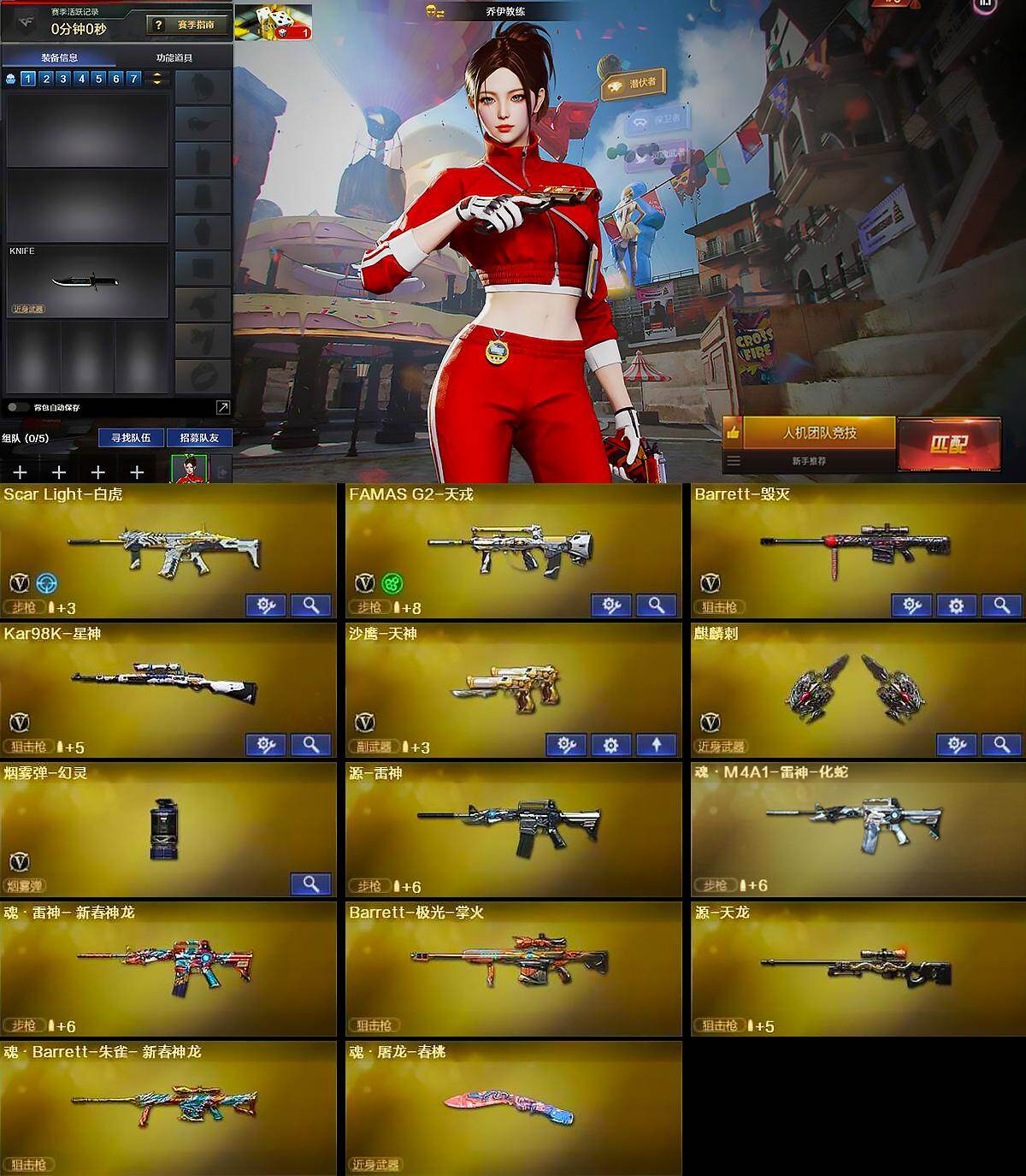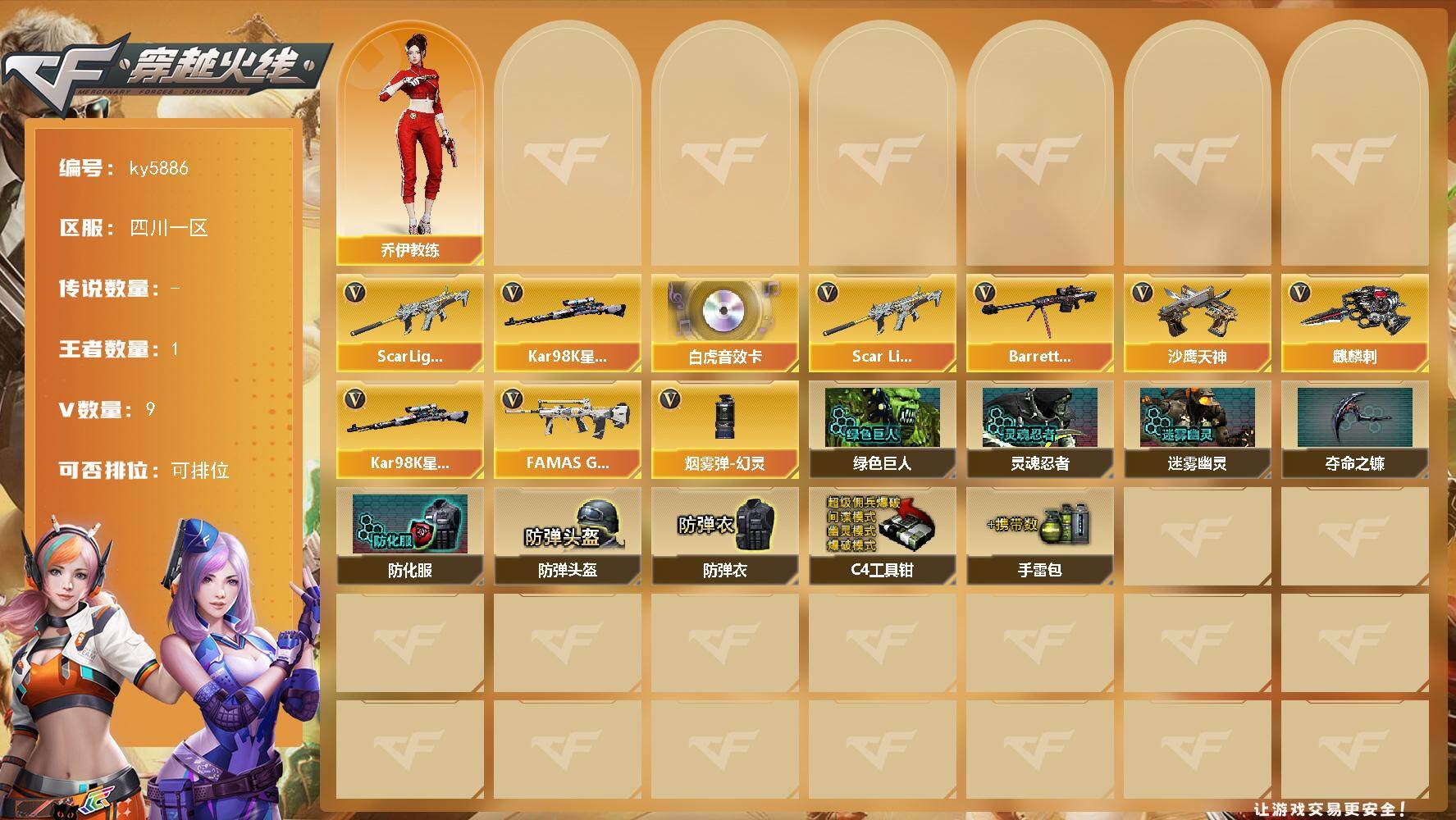 [17022299]四川一区-10V-1王者武器数-0炫金武器数 【热门武器】:Scar Light-白虎,Kar98K-星神 【音效卡】:Scar Light-白虎音效卡 【角色】:乔伊教练 【英雄级武器】:Scar Light-白虎,FAMAS G2-天戎,Barrett-毁灭,Kar98K-星神,沙鹰-天神,麒麟刺,烟雾弹-幻灵 【道具】:绿色巨人,灵魂忍者,迷雾幽灵,夺命之镰,防化服*2,防弹头盔*2,防弹衣*2,C4工具钳*2,手雷包*2 【特殊枪械】:1白虎