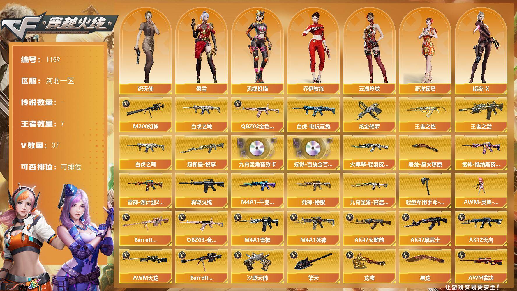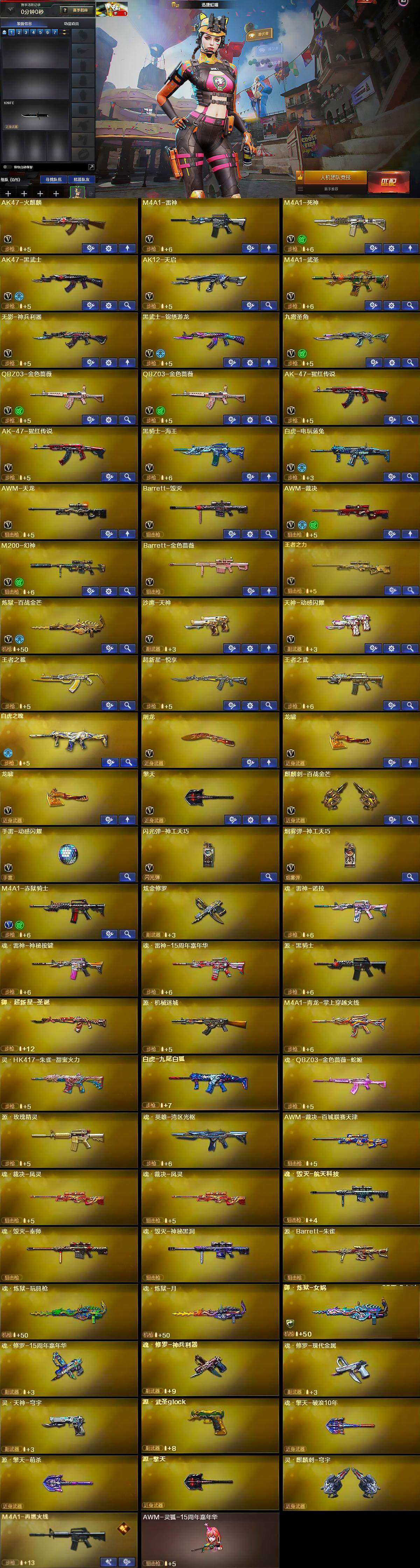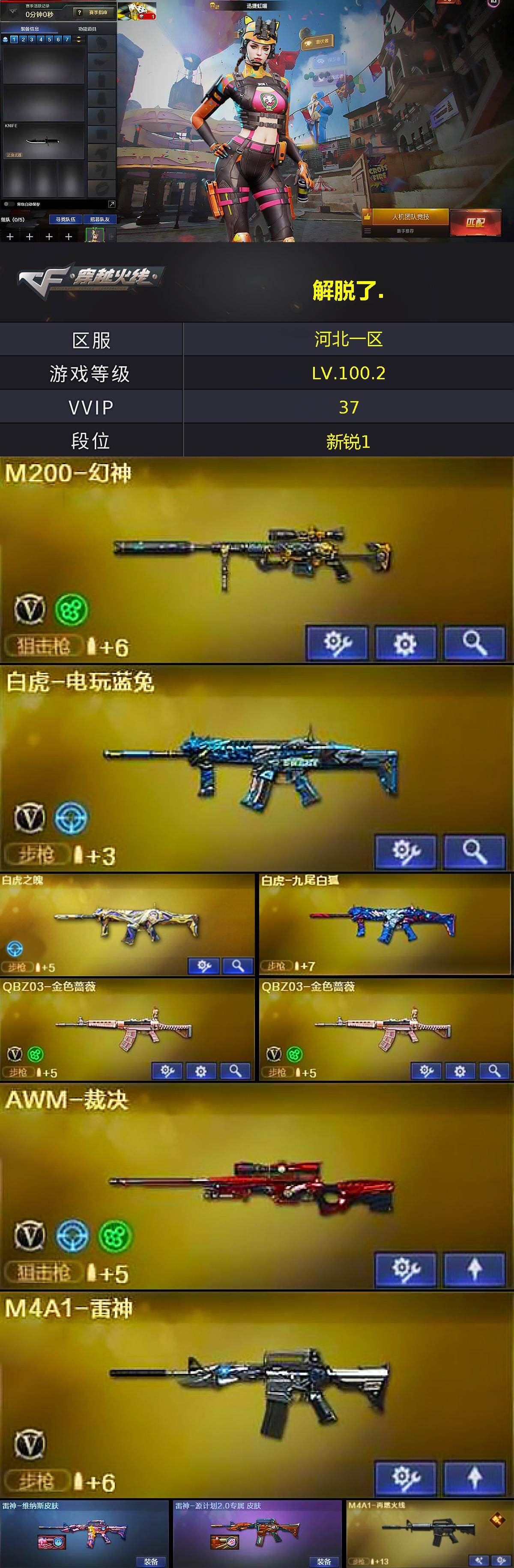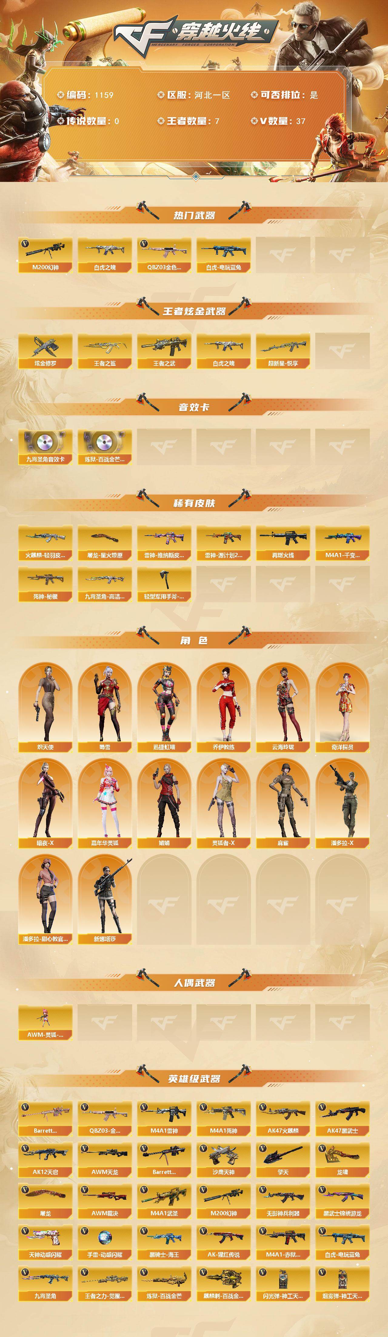 [16681566]河北一区-37V-7王者武器数-1炫金武器数 【热门武器】:QBZ03-金色蔷薇*2,M200-幻神,白虎之魄,白虎-电玩蓝兔 【王者炫金武器】:王者之鲨,超新星-悦享,王者之武,白虎之魄,炫金修罗 【音效卡】:九霄圣角音效卡,炼狱-百战金芒-庆典舞曲音效卡 【皮肤】:雷神-维纳斯皮肤,雷神-源计划2.0专属 皮肤,M4A1-再燃火线,火麒麟-轻羽皮肤,M4A1-千变-孔明皮肤,死神-秘银,九霄圣角-高洁仙镜 皮肤,屠龙-星火燎原,轻型军用手斧-再燃火线 【角色】:迅捷虹喵,奇洋探员,乔伊教练,云海玲珑,炽天使,暗夜-X,嘉年华灵狐,娟娟,灵狐者-X,麻雀,潘多拉-X,潘多拉-甜心教官,蜀雪,新娜塔莎 【人偶武器】:AWM-灵狐-15周年嘉年华 【英雄级武器】:AK47-火麒麟,M4A1-雷神,M4A1-死神,AK47-黑武士,AK12-天启,M4A1-武圣,无影-神兵利器,黑武士-锦绣游龙,九霄圣角,QBZ03-金色蔷薇*2,AK-47-猩红传说*2,黑骑士-海王,白虎-电玩蓝兔,AWM-天龙,Barrett-毁灭,AWM-裁决,M200-幻神,Barrett-金色蔷薇,王者之力-觉醒版,炼狱-百战金芒,沙鹰-天神,天神-动感闪耀,屠龙,龙啸*2,擎天,麒麟刺-百战金芒,手雷-动感闪耀,闪光弹-神工天巧,烟雾弹-神工天巧,M4A1-赤狱骑士 【道具】:XROCK炫彩背包,亚洲杯纪念炫彩背包,全能枪王背包,百战金芒炫彩背包,背包-洛丽塔,超级背包,女皇终结者-魔龙之吻,救世主-黑桃战神,妩媚妖姬,绿色巨人,灵魂忍者,迷雾幽灵,生化弹匣,夺命之镰,防化服*3,金色流光-枪王排位*2,星辰流光-枪王排位,枪王排位28赛季金色流光,枪王排位29赛季金色流光,语音特效-盛典烟火,萌萌小葵表情,EP战队击杀图标,防弹头盔*3,防弹衣*3,C4工具钳*3,手雷包*3 【特殊枪械】: