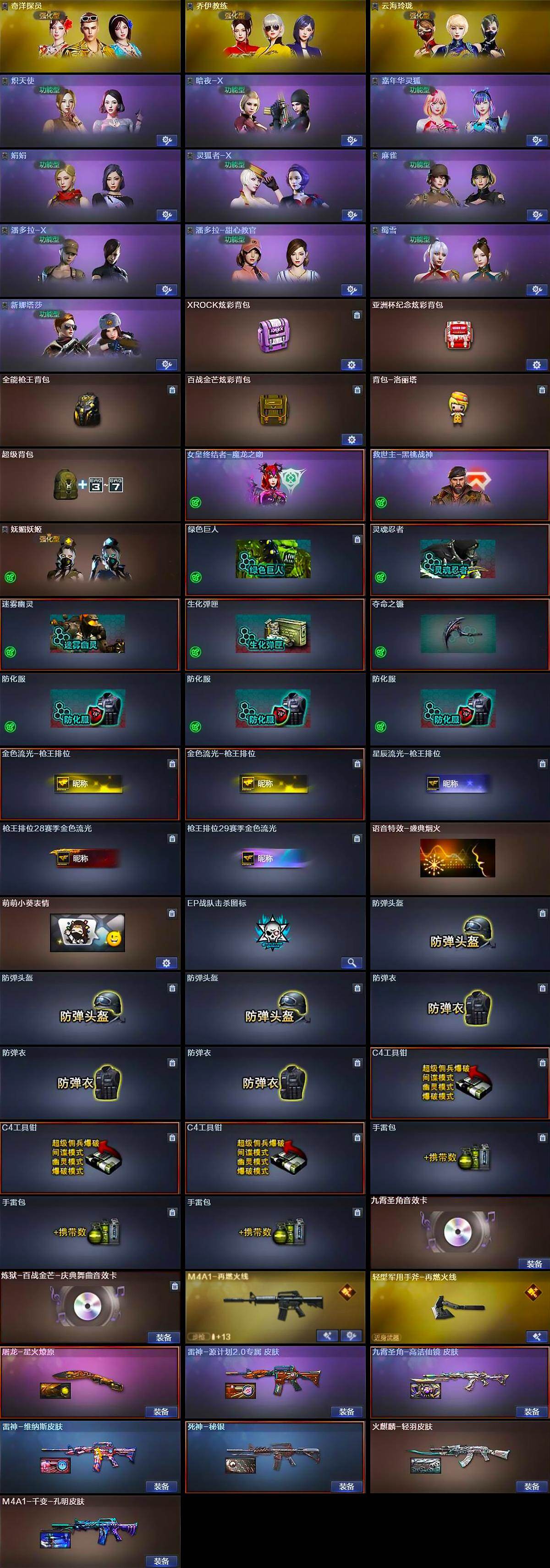 【道具】:XROCK炫彩背包,亚洲杯纪念炫彩背包,全能枪王背包,百战金芒炫彩背包,背包-洛丽塔,超级背包,女皇终结者-魔龙之吻,救世主-黑桃战神,妩媚妖姬,绿色巨人,灵魂忍者,迷雾幽灵,生化弹匣,夺命之镰,防化服*3,金色流光-枪王排位*2,星辰流光-枪王排位,枪王排位28赛季金色流光,枪王排位29赛季金色流光,语音特效-盛典烟火,萌萌小葵表情,EP战队击杀图标,防弹头盔*3,防弹衣*3,C4工具钳*3,手雷包*3