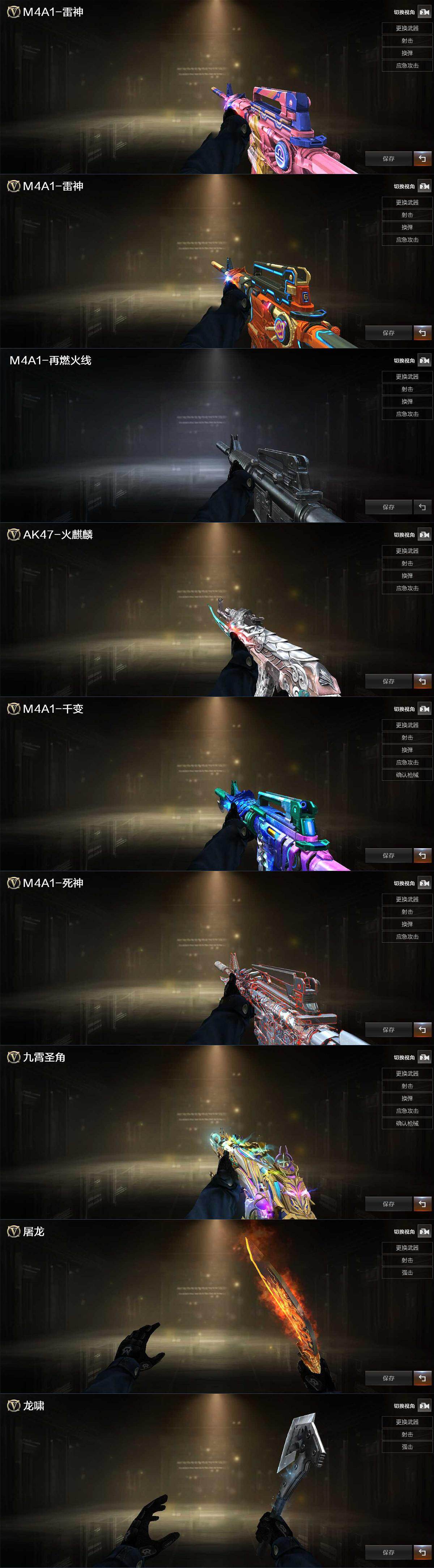 【皮肤】:雷神-维纳斯皮肤,雷神-源计划2.0专属 皮肤,M4A1-再燃火线,火麒麟-轻羽皮肤,M4A1-千变-孔明皮肤,死神-秘银,九霄圣角-高洁仙镜 皮肤,屠龙-星火燎原,轻型军用手斧-再燃火线
