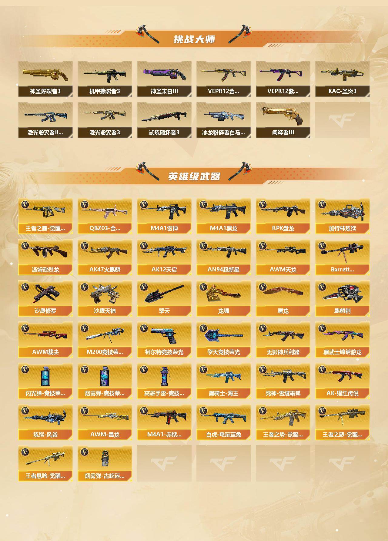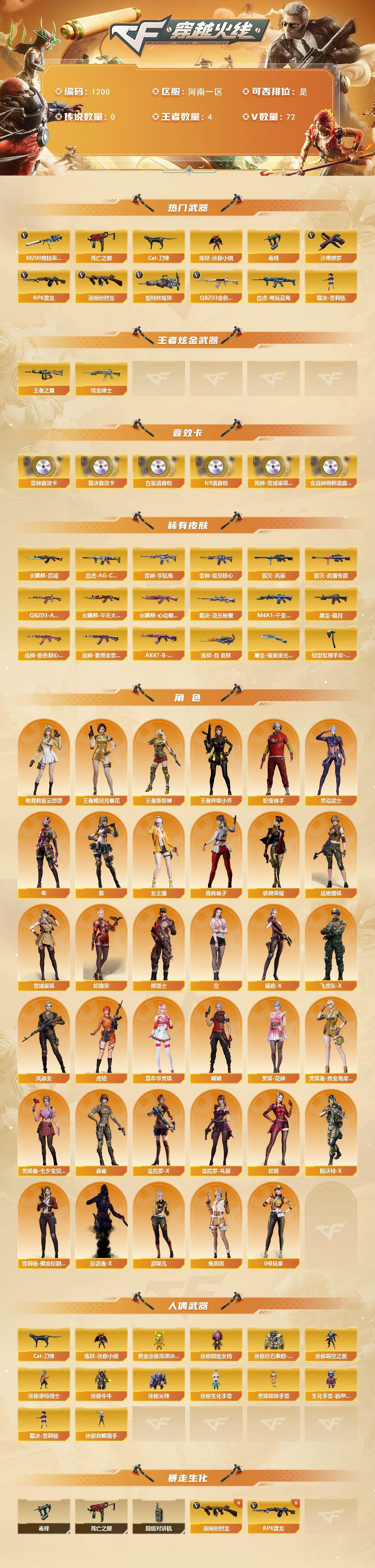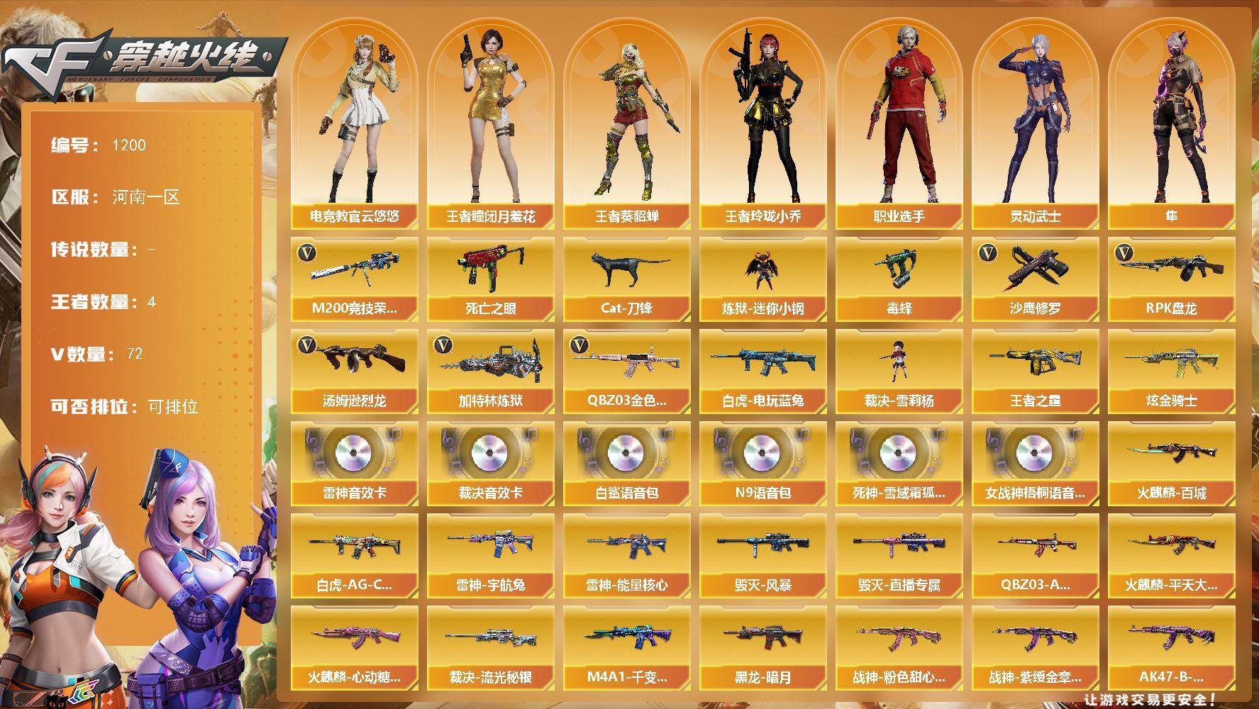 - [11530073]12V武器 可二次 可修改实名 优质装备:M200-幻神,传说辉光,Kar98k-星神,柯尔特-荣耀世冠白鲨2023,M4A1-黑龙,AWM-裁决,AK12-天启,屠龙 排位资格:有 王者武器:王者风神-觉醒版 热门武器:COP-白鲨