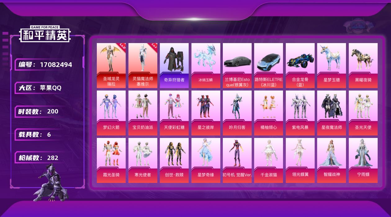 [17082494]苹果 手Q-2神装-21粉装-24特效枪-6载具-11粉色飞行器-110506热力值-11王牌印记-200套装-282枪皮