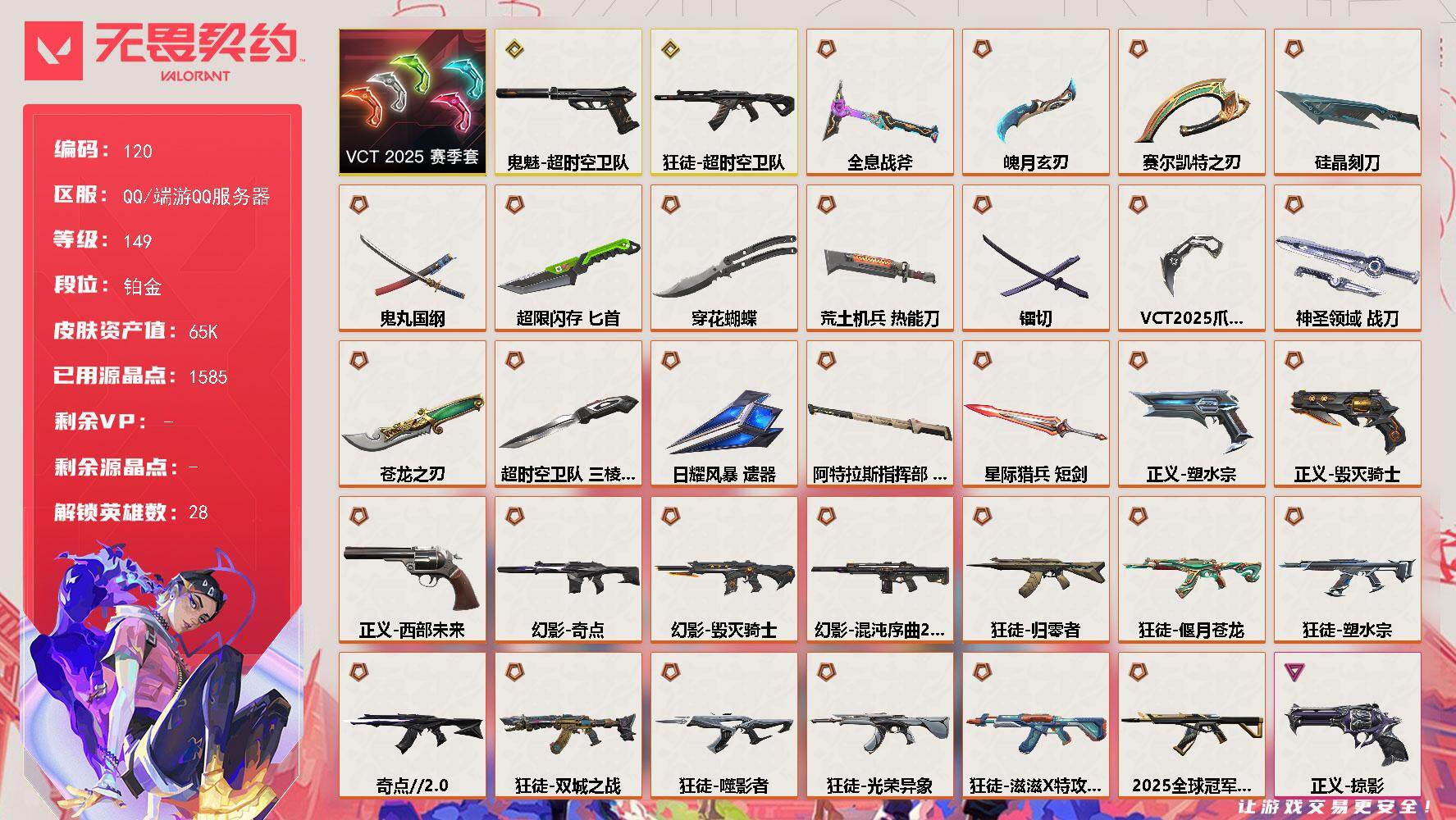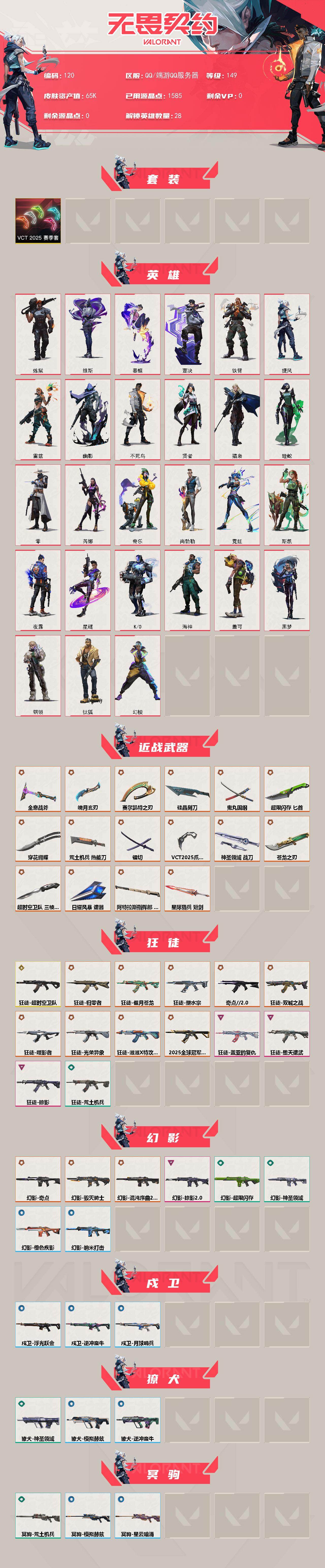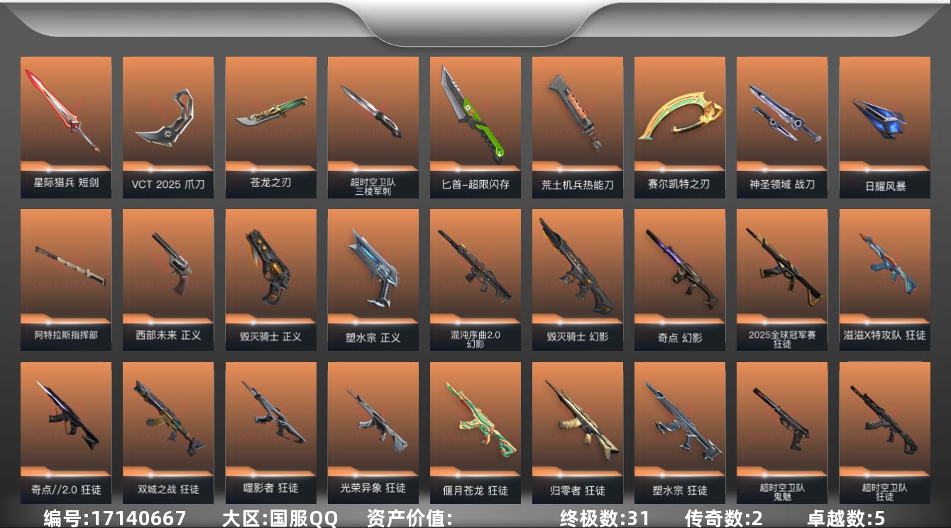[17140667]【120】【套装】:VCT 2025 赛季套装 【英雄】:幻棱,炼狱,维斯,暮蝶,钛狐,壹决,铁臂,捷风,雷兹,幽影,不死鸟,贤者,猎枭,蝰蛇,零,芮娜,奇乐,尚勃勒,霓虹,斯凯,夜露,星礈,K/O,海神,盖可,黑梦,钢锁 【近战武器】:近战武器-超时空卫队 三棱军刺,近战武器-5周年//公测重制版 苍龙之刃,近战武器-穿花蝴蝶,近战武器-VCT 2025 爪刀,近战武器-镭切,近战武器-鬼丸国纲,近战武器-超限闪存 匕首,近战武器-硅晶刻刀,近战武器-荒土机兵 热能刀,近战武器-魄月玄刃,近战武器-全息战斧,近战武器-赛尔凯特之刃,近战武器-神圣领域 战刀,近战武器-日耀风暴 遗器,近战武器-阿特拉斯指挥部 甩棍,近战武器-星际猎兵 短剑 【狂徒】:狂徒-超时空卫队,狂徒-2025全球冠军赛,狂徒-归零者,狂徒-奇点//2.0,狂徒-双城之战,狂徒-塑水宗,狂徒-偃月苍龙,狂徒-噬影者,狂徒-光荣异象,狂徒-滋滋X特攻队,狂徒-堕天遗武,狂徒-掠影,狂徒-盖亚的复仇,狂徒-荒土机兵 【幻影】:幻影-毁灭骑士,幻影-奇点,幻影-混沌序曲//2.0,幻影-掠影//2.0,幻影-超限闪存,幻影-神圣领域,幻影-橙色疾影,幻影-纳米打击 【戍卫】:戍卫-浮光跃金,戍卫-逆冲蛮牛,戍卫-月球哨兵 【獠犬】:獠犬-神圣领域,獠犬-模拟赫兹,獠犬-逆冲蛮牛 【冥驹】:冥驹-荒土机兵,冥驹-模拟赫兹,冥驹-星云暗涌 【莽侠】:莽侠-超限闪存,莽侠-月球哨兵 【战神】:战神-神圣领域,战神-浮光跃金 【奥丁】:奥丁-纳米打击 【判官】:判官-纳米打击x 【雄鹿】:雄鹿-模拟赫兹,雄鹿-逆冲蛮牛,雄鹿-月球哨兵 【骇灵】:骇灵-荒土机兵,骇灵-浮光跃金,骇灵-晶态集成,骇灵-星云暗涌 【蜂刺】:蜂刺-超限闪存,蜂刺-星云暗涌 【标配】:标配-荒土机兵,标配-浮光跃金 【正义】:正义-毁灭骑士,正义-塑水宗,正义-西部未来,正义-掠影,正义-超限闪存,正义-纳米打击,正义-月球哨兵 【鬼魅】:鬼魅-超时空卫队,鬼魅-模拟赫兹,鬼魅-星云暗涌 【狂怒】:狂怒-神圣领域,狂怒-逆冲蛮牛 【短炮】:短炮-弧光异彩 【卡面】:终章:激斗汉堡 卡面,进入射程 卡面,分崩离析 卡面,纳米打击 卡面,抑制技术 卡面,激斗汉堡 卡面,瓦娃脸雪糕 P2 卡面,从黄昏到黎明 卡面,荒土机兵 卡面,银弹猎