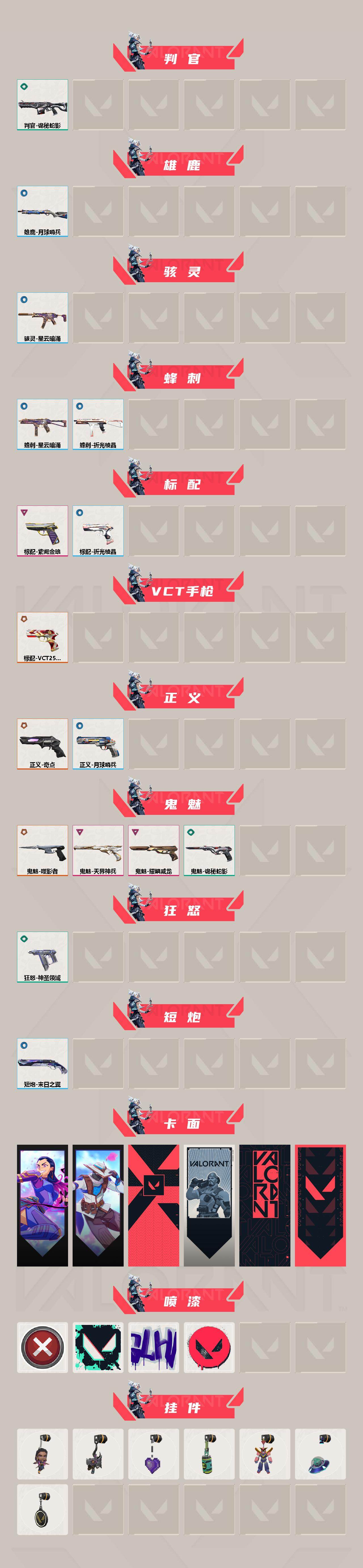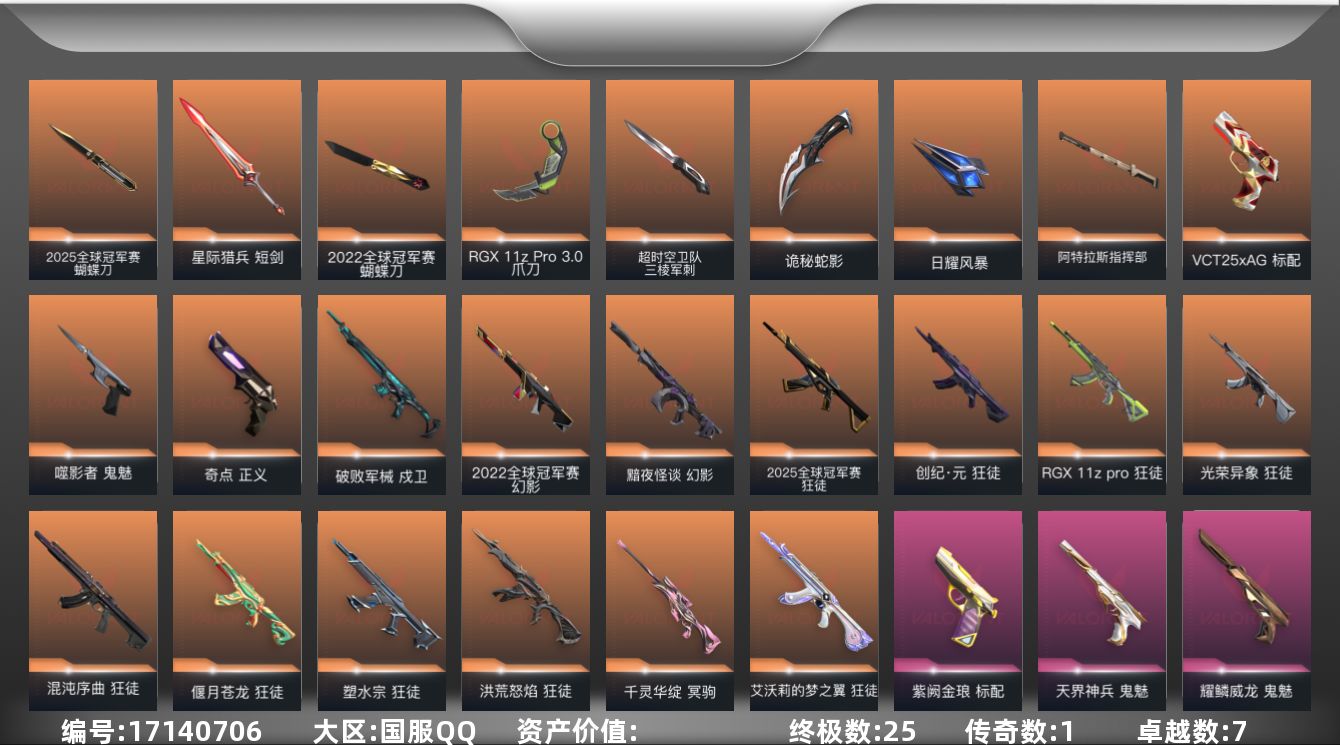 [17140706]【121】【套装】:2025全球冠军赛套装,2022全球冠军赛套装 【英雄】:幻棱,炼狱,维斯,暮蝶,钛狐,壹决,铁臂,捷风,雷兹,幽影,不死鸟,贤者,猎枭,蝰蛇,零,芮娜,奇乐,尚勃勒,霓虹,斯凯,夜露,星礈,K/O,海神,盖可,黑梦,钢锁 【近战武器】:近战武器-2025全球冠军赛 蝴蝶刀,近战武器-2022全球冠军赛 蝴蝶刀,近战武器-超时空卫队 三棱军刺,近战武器-RGX 11z Pro//3.0 爪刀,近战武器-镭切,近战武器-诡秘蛇影 军刀,近战武器-日耀风暴 遗器,近战武器-阿特拉斯指挥部 甩棍,近战武器-星际猎兵 短剑 【狂徒】:狂徒-艾沃莉的梦之翼,狂徒-2025全球冠军赛,狂徒-洪荒怒焰,狂徒-混沌序曲,狂徒-塑水宗,狂徒-偃月苍龙,狂徒-创·纪元,狂徒-RGX 11z Pro,狂徒-光荣异象,狂徒-堕天遗武,狂徒-盖亚的复仇,狂徒-诡秘蛇影 【幻影】:幻影-2022全球冠军赛,幻影-黯夜怪谈,幻影-侦察力量,幻影-神圣领域,幻影-末日之翼 【戍卫】:戍卫-破败军械,戍卫-天界神兵,戍卫-折光棱晶 【冥驹】:冥驹-千灵华绽 【飞将】:飞将-末日之翼 【莽侠】:莽侠-诡秘蛇影,莽侠-月球哨兵 【战神】:战神-神圣领域 【奥丁】:奥丁-末日之翼 【判官】:判官-诡秘蛇影 【雄鹿】:雄鹿-月球哨兵 【骇灵】:骇灵-星云暗涌 【蜂刺】:蜂刺-星云暗涌,蜂刺-折光棱晶 【标配】:标配-紫阙金琅,标配-折光棱晶 【VCT手枪】:标配-VCT25 x AG 【正义】:正义-奇点,正义-月球哨兵 【鬼魅】:鬼魅-噬影者,鬼魅-天界神兵,鬼魅-耀鳞威龙,鬼魅-诡秘蛇影 【狂怒】:狂怒-神圣领域 【短炮】:短炮-末日之翼 【卡面】:无畏契约GO!第一卷:芮娜 卡面,无畏契约GO!第一卷:零 卡面,代号红色 卡面,新兵报到 卡面,V契约 卡面,无畏契约 卡面 【喷漆】:买装还是存钱 喷漆,胜利属于无畏契约 喷漆,GLHF 喷漆,无畏契约 喷漆 【挂饰】:无畏契约GO!第一卷 芮娜 挂饰,鱼骨头 挂饰,薰衣草之心 挂饰,Z世代特饮 挂饰,迷你机甲 挂饰,天外飞客 挂饰,无畏契约 纪念币 挂饰